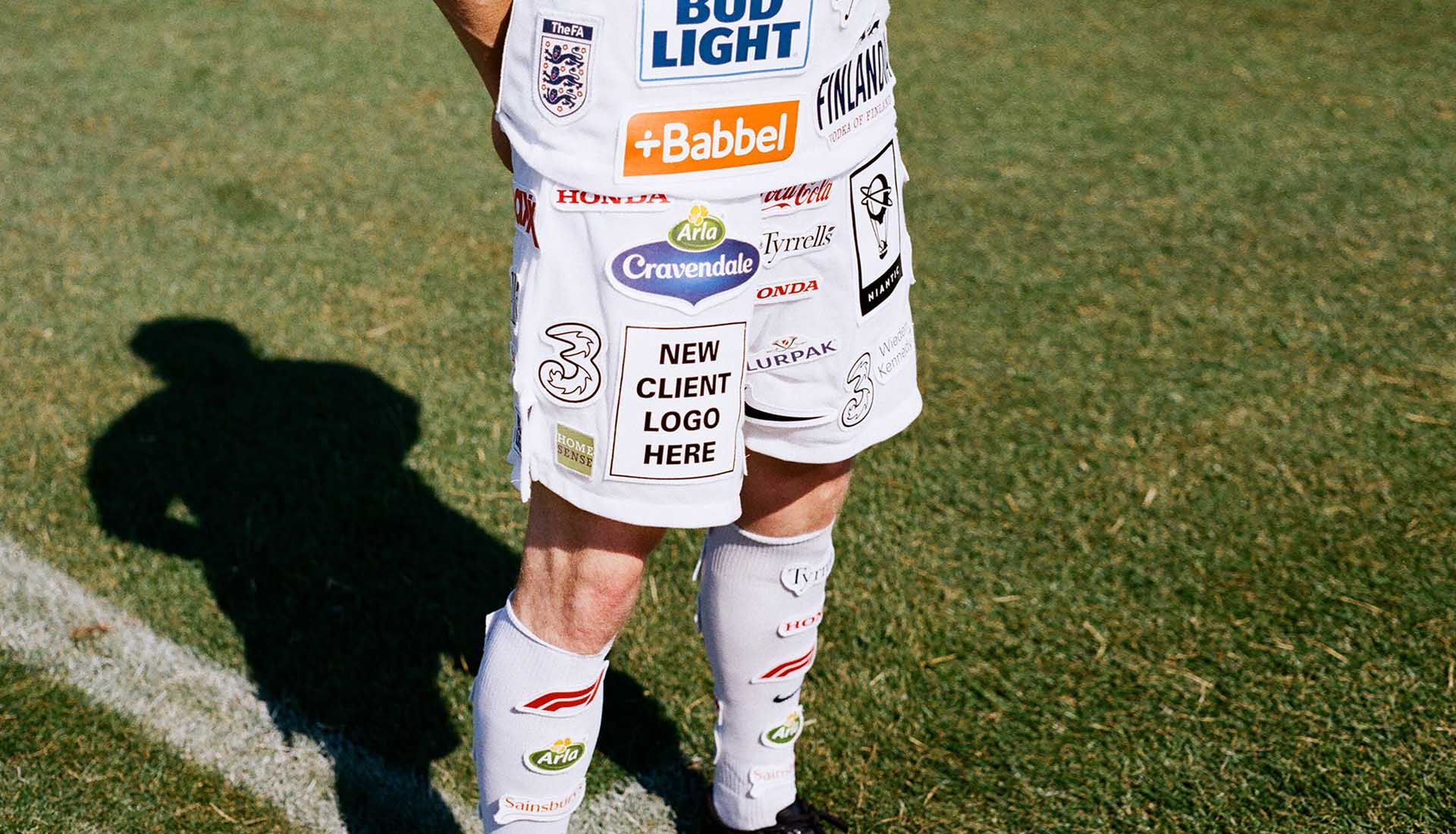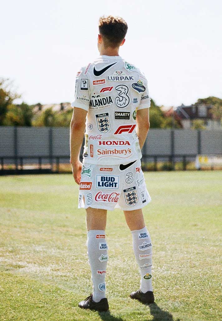Every single logo featured on the all white kit is a client of Wieden+Kennedy as the agency share the love across the shirt, shorts and socks with the brand's respective identities. More sponsors than a South American club trying to solve a financial crisis, this.
