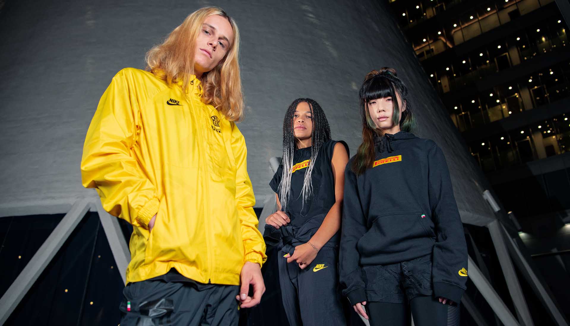 A number of key pieces make up the collection, none more so than the NRG Jacket which features the Pirelli logo on the chest along with a minimal Inter Milan club crest, Nike Futura logo and Italian flag on the sleeve as a nod to racing uniforms. A treble-branded logo also sits on the rear of the neck to further celebrate the link up. Long sleeve and short sleeve tees in black and yellow with racing flag graphics also feature in the series, along with a low-key hoodie and a statement full racing suit.