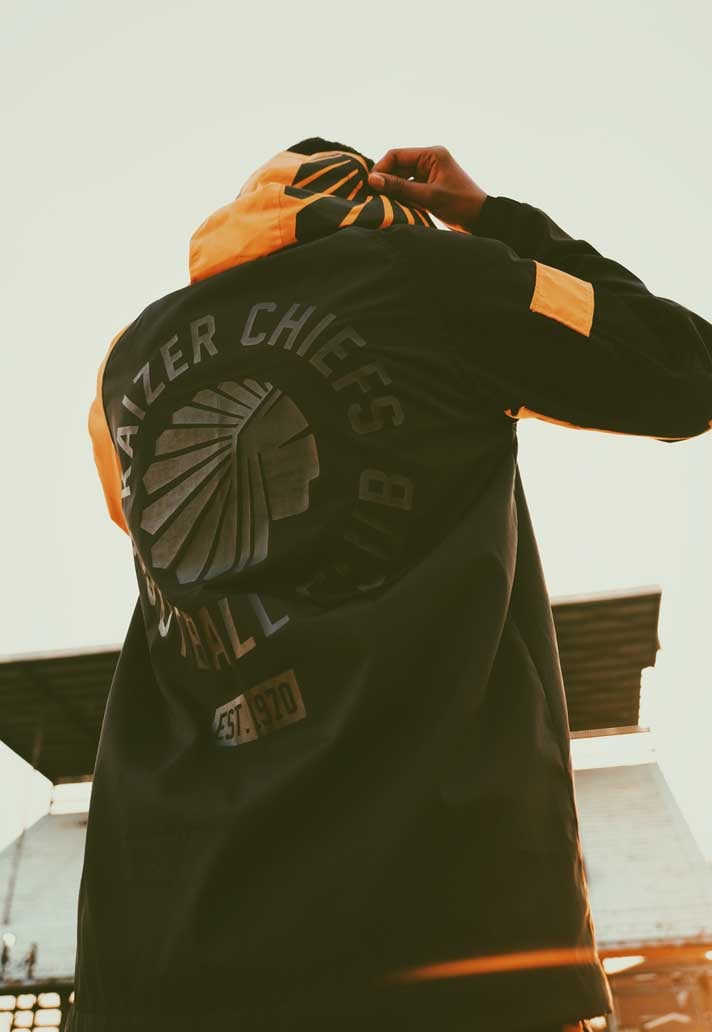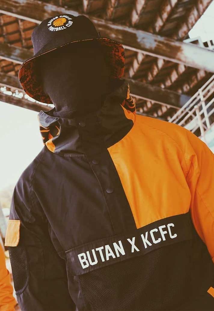 The Butan x Kaizer Chiefs partnership represents the first South African collaboration to touch the streets and the football pitch with an iconic limited edition capsule merging two seemingly unrelated, yet deeply connected worlds. The collection, which uses Kaizer Chiefs' primary orange and black colours, includes a windbreaker jacket, long and short sleeve tees, bucket hat, socks, and shorts,