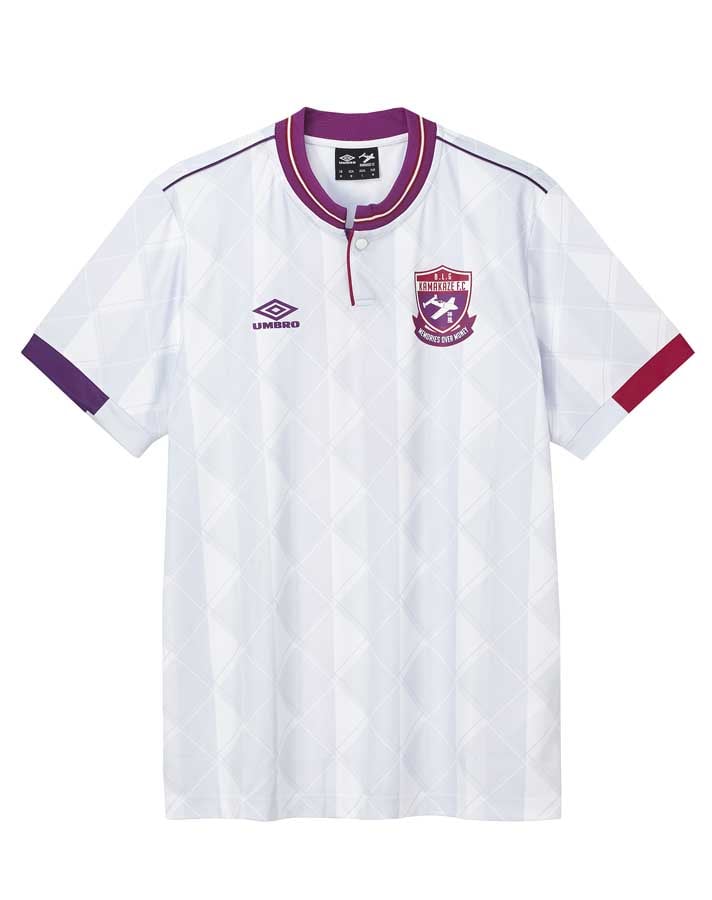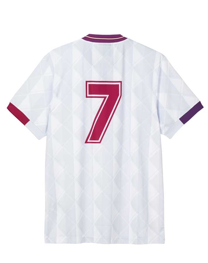 Designed by Kamakaze and Umbro, the shirt sees the original contrast crew-neck collar, complete with stud fastening, updated in burgundy with red accents; this change up itself influenced by one particularly heroic and claret-tinged post-match photograph of the original shirt from 1989 featuring a blood-stained Terry Butcher. Archive-inspired white/grey diamond print contrasts are also revived alongside colour-pop tabs on sleeves.