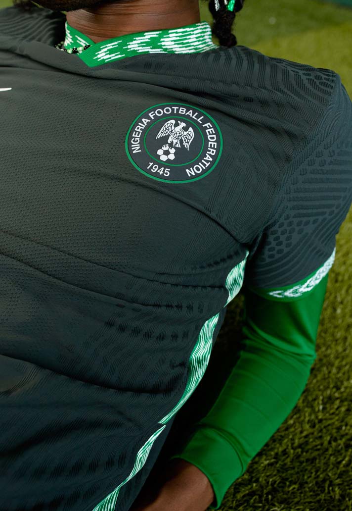 The new home kit fuses the traditional aesthetic of an agbada robe with modern football design. The kit’s pattern was hand drawn and is highly symbolic of Nigerian heritage with nods to nobility and family. Nigeria’s crest is placed centrally on the chest with a Swoosh underneath it. The player names and numbers integrate the eagle feather into the application. “Naija” appears inside the neck of jersey and on the back of the socks in a new typeface.