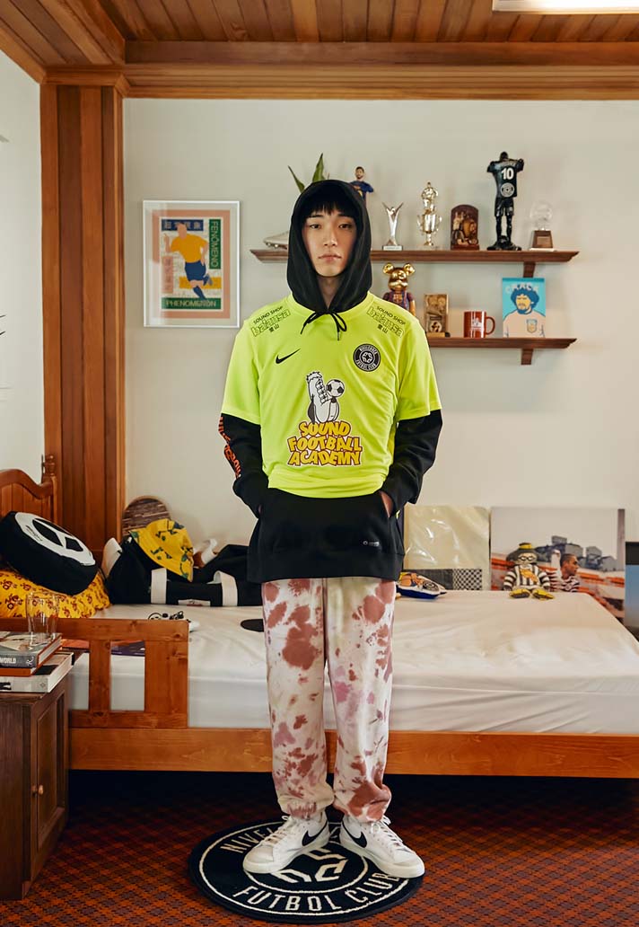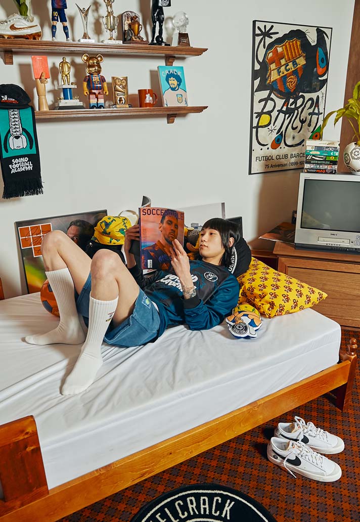 Back in June, Nivelcrack had stepped beyond the realms of fantasy football to pair up with K-League side Seongnam FC, legitimising their off-centre stylings. But now they’re back in their comfort zone, working with vintage clothing store Balansa to release a Sound Football Academy collection, consisting of football jersey, training bib, scarf, ball, hoodies, cap, duffle bag and more.