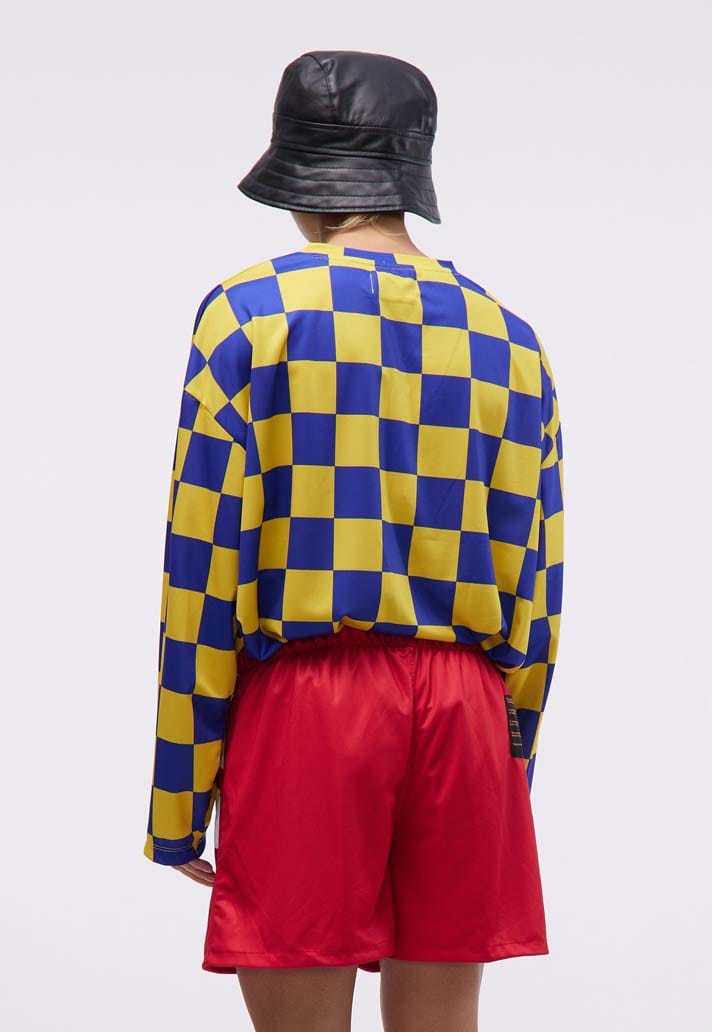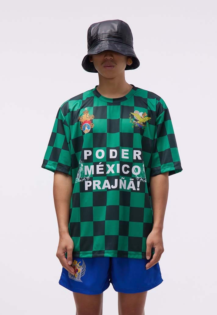 So the first thing you may think of when you see Liberal Youth Ministry’s SS21 football shirt-inspired series is Croatia. That’s be fair enough, given the chequered design template, and it’s most apparent with the “Red/White” Fake News jersey. But then there is further international inspiration in the collection, with the green shirt carrying with it some Mexican vibes that many think the current shirt is severely lacking.