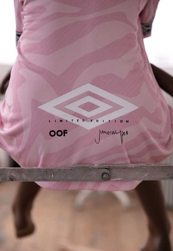 Juno Calypso has gone on to become one of the most recognisable photographers working today, forging a totally unique aesthetic that has seen her go on to collaborate with major fashion brands including Burberry and Stella McCartney. Juno’s shirt for the OOF x UMBRO collaboration plays on familiar Calypso themes, emblazoned with the name of an imagined brothel, and set against a heady wall of wavy pink stripes. It's confrontational, sinister and undeniably Juno Calypso.
