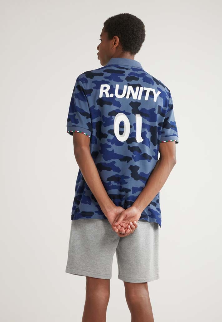 Military camo prints with Italy’s signature blue strip and adding a reference to Robert Baggio's iconic number 10 on the polo shirt, an overshirt creates a commanding casual look.
