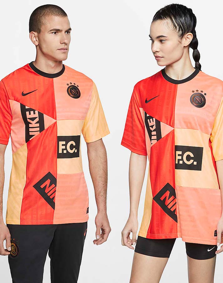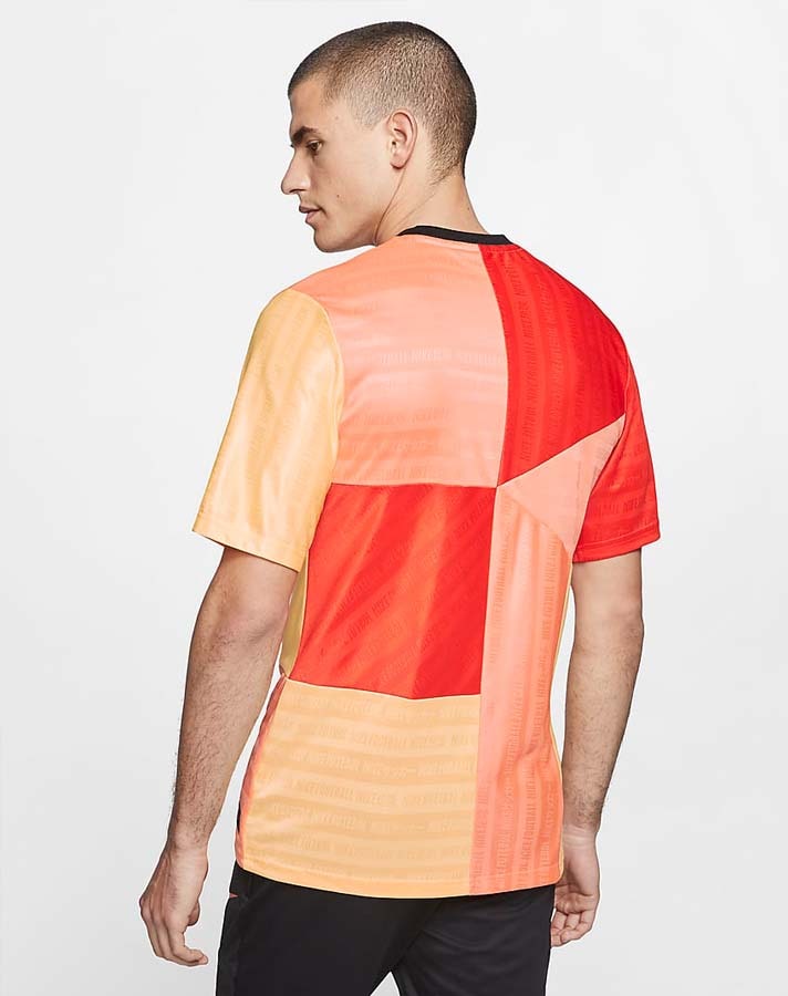 And so it is here also for Nike’s Germany kits. The same geometric design is executed across both home and away, with home arriving in a monochromatic black and white look, while the away is given a more vibrant “Atomic Pink/Habanero Red/Melon Tint/Black” look. It’s a template that has been seen before in the Nike F.C. repertoire, and it features an all-over print that reads "Nike Soccer" in many football-playing languages. But setting it away from what’s come before is a bespoke Germany crest, which comes complete with four stars above.