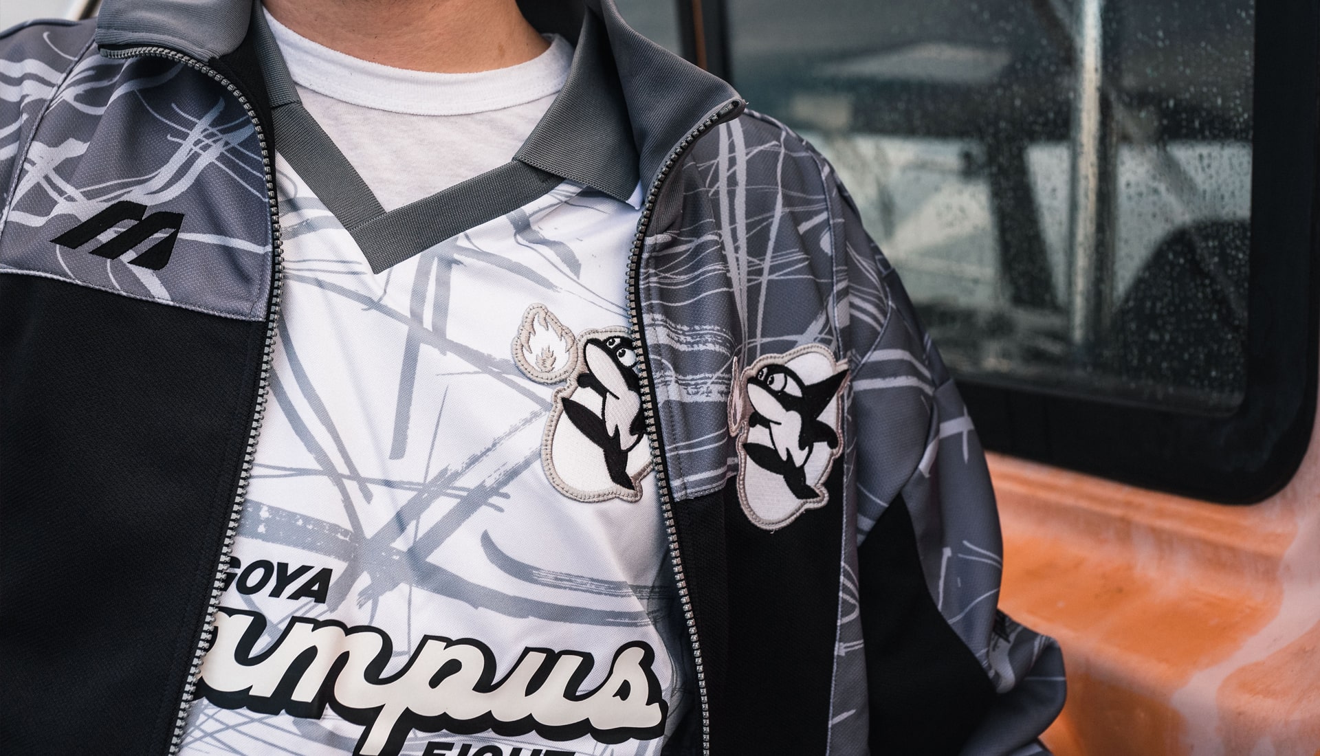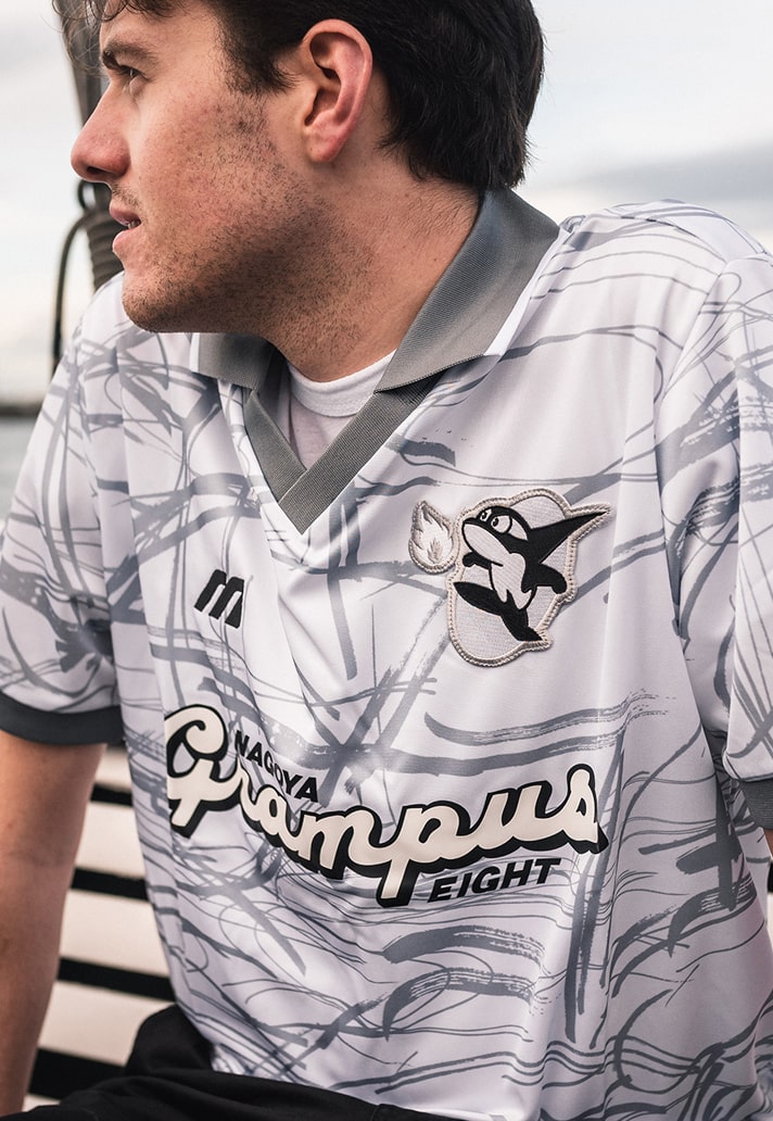 The Risso’s dolphin has a distinctive grey body characterised by its unique ‘scored’ markings which appear over time, so, taking inspiration from this, the HANON x Nagoya Grampus ‘93 Jersey features grey markings applied on top of a white base contrasted by grey ribbed sleeves and collar. Details include a Nagoya Grampus Eight logo located where the sponsor would traditionally be found, as well as an embroidered ‘M’ logo on the chest, and Mizuno logo on the sleeve. Dual branding appears by way of a woven patch at the hem, and there’s also a reinterpretation of Nagoya’s classic dolphin logo, which replaces the football with the HANON Flame.