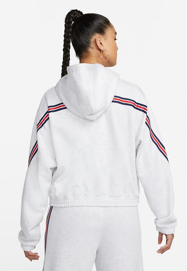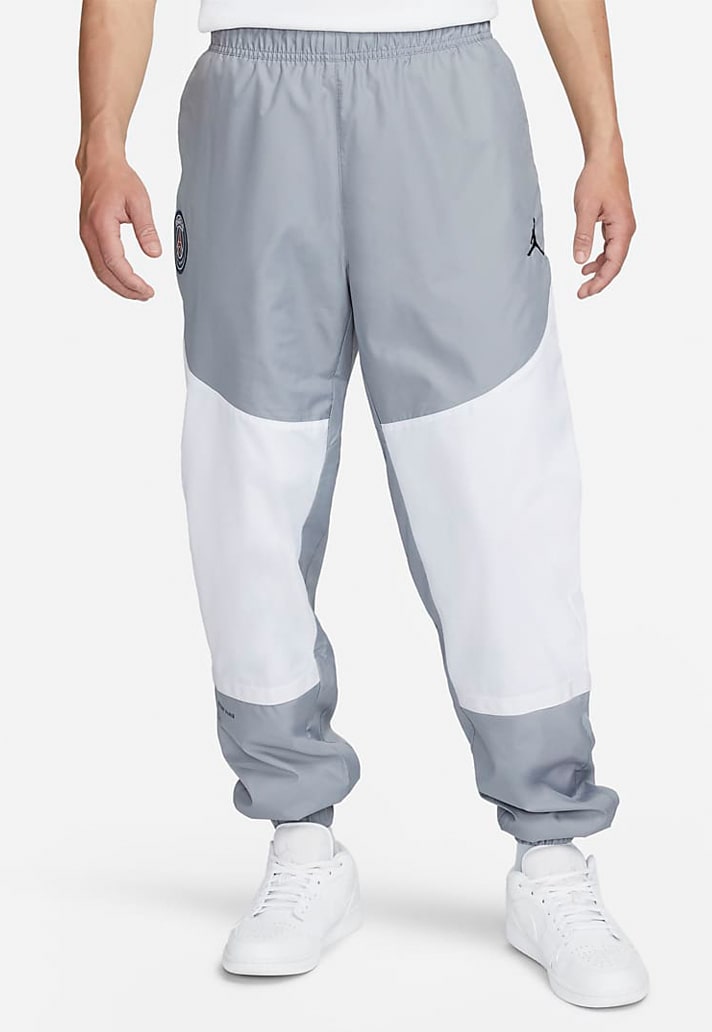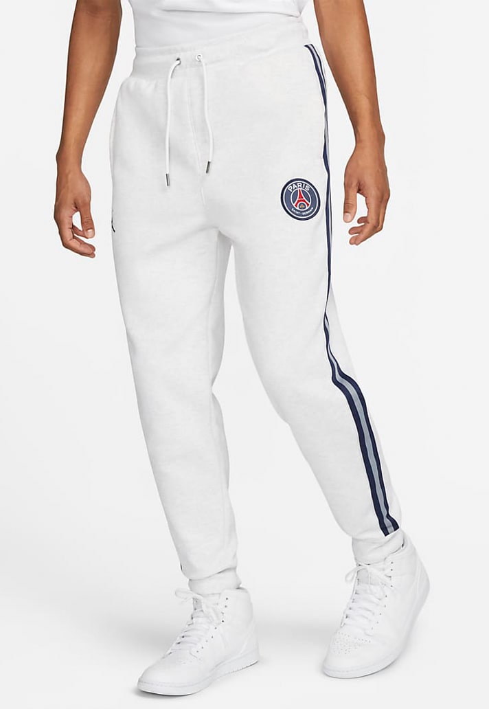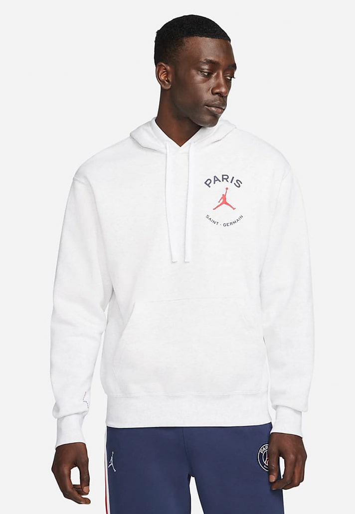 In the footwear department there's the PSG Air Jordan 1 Mid, and it comes suitably suited up with a clean white base joined by grey accents through suede overlaid panels on the collar and through the outsole. The Swoosh flashes down the sides in navy, while the Air Jordan logo acts as the perfect sign off, standing out in red on the suede panels.