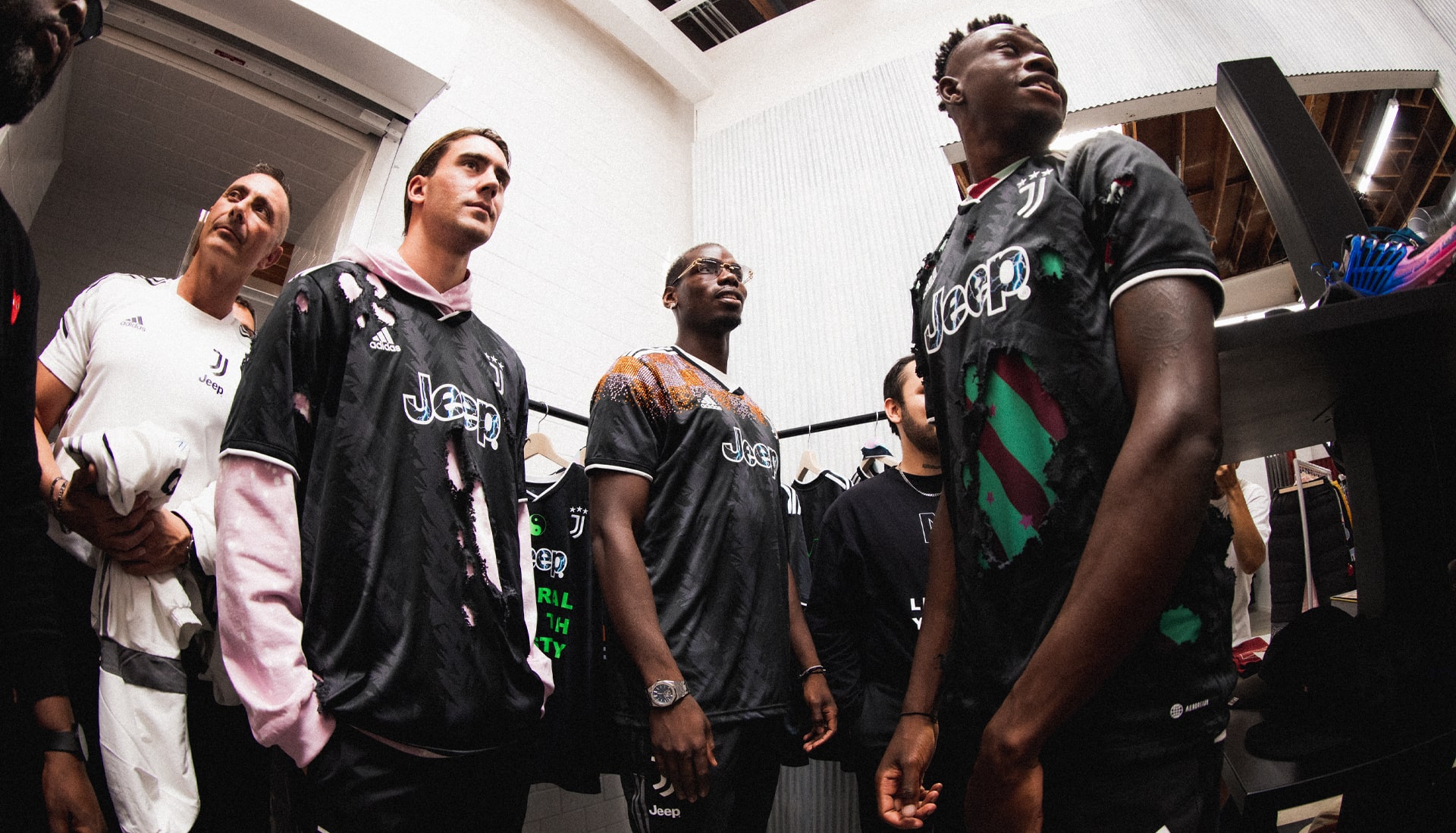Juventus players, including newly resigned Paul Pogba, hit up Dover Street Market Los Angeles to launch the collection that features brightly-coloured prints underneath the dark exterior of the Juve away shirt outer layer, as well as a shirt embellished with Swarovski crystals – something we’ve seen adidas tinker with on the Predator not all that long ago.