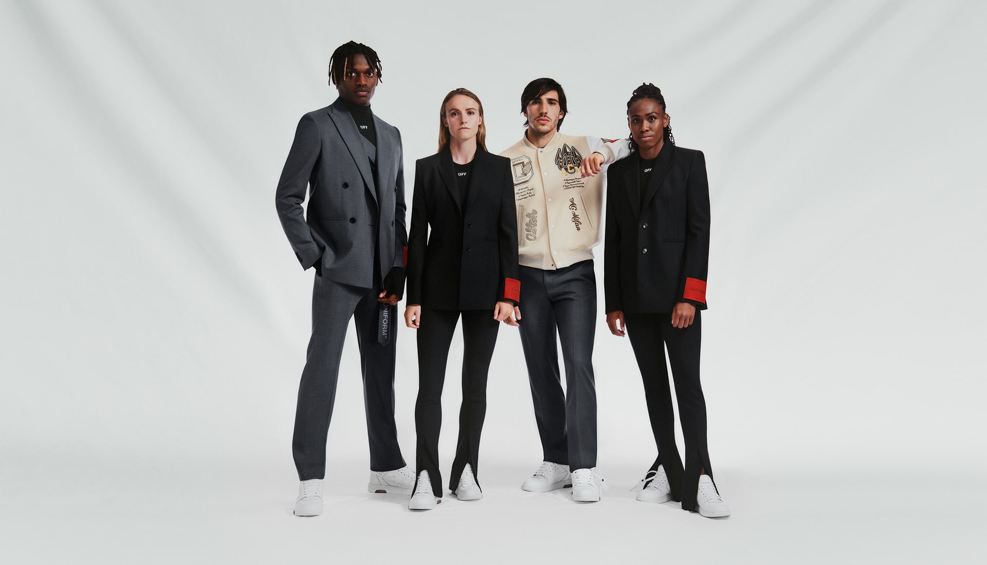 The informal uniform retains the pants, shirts, and accessories of the formal uniform but replaces the suit jacket with the Varsity jacket: an Off-White style hallmark championed by the brand's founder Virgil Abloh. For AC Milan, the Varsity jacket is crafted from white leather and introduces graphic patches, including Off-White stripes down the right sleeve and the AC Milan diavolo mascot on the body.