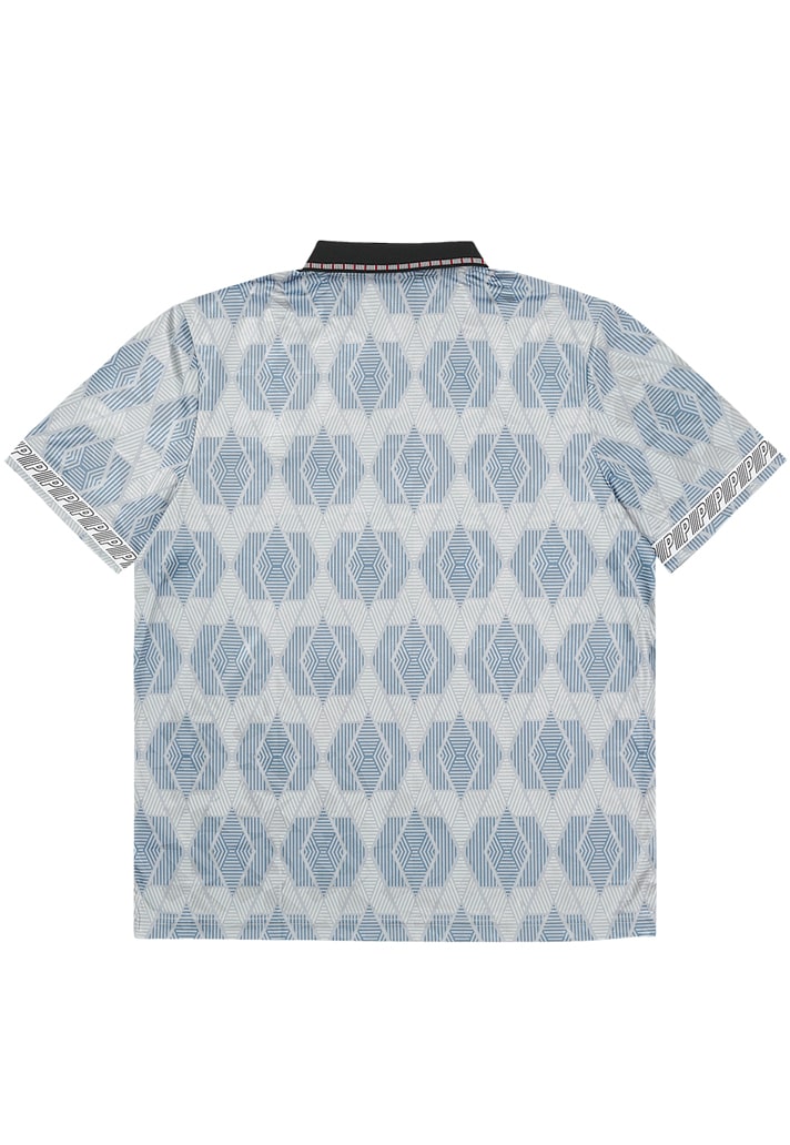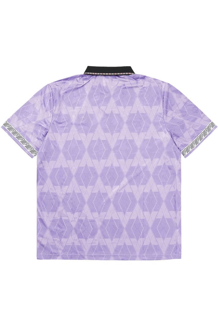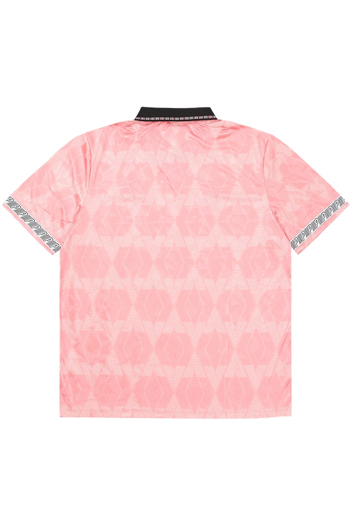 Available in Vermillion, Geranium Pink, Florida Keys, Dahlia purple and Neutral Gray, the short-sleeved tops feature a cracked Ice jacquard pattern overlaid with a digital print. The contrast black flat knit rib collar is tipped with two colours and features a ticking stripe, Cotton insert with buttons. Sleeves are finished with a Palace branded tape at the cuffs. A 1990’s Umbro logo and a Place embroidered logo sign off the product across the chest.