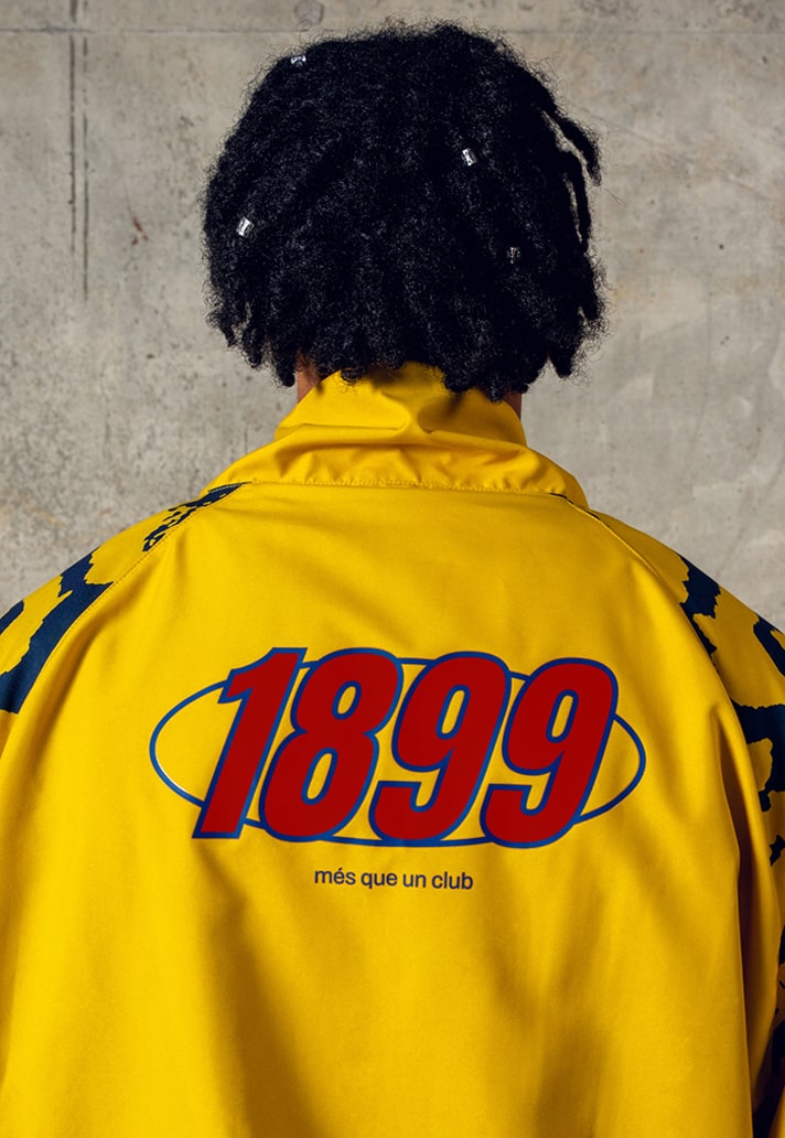 The collection centres around the club’s traditional blaugrana colours, spread across a jacket, shirt, tees and a bucket hat. For the most part an animal print (Tiger? Zebra? You decide) dominates the looks, notably on the standout Light Crest Jacket. Several pieces from the capsule feature “1899”, a callout to the club’s foundation year. Other features include the club’s motto, “Mes Que Un Club”, the club crest, and the wording “Barça”.