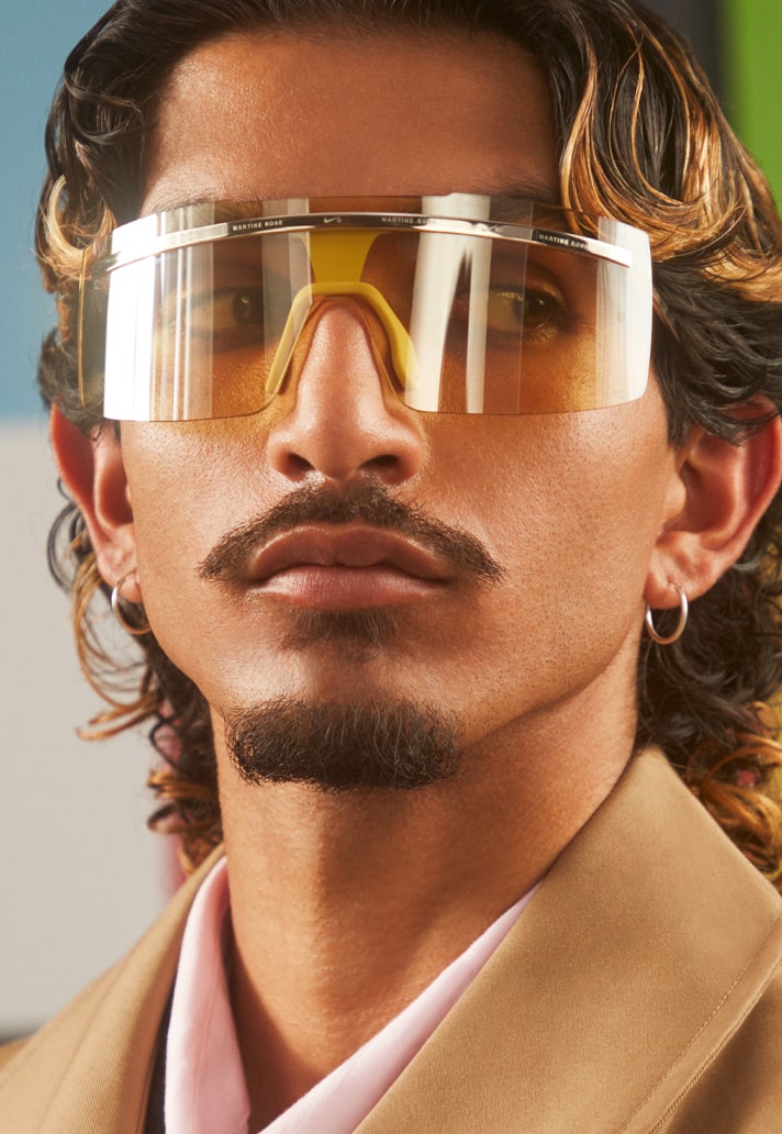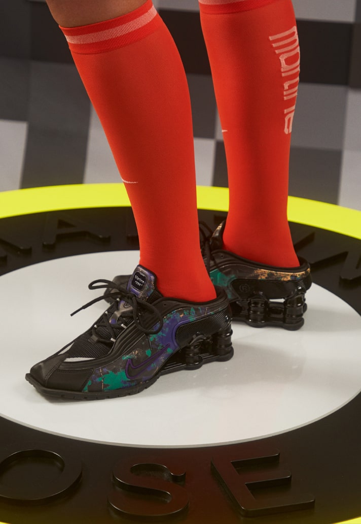 The Nike x Martine Rose Collection features a player’s suit jacket, trouser, trench and shirt; accessories, including stockings, gloves and sunglasses; and the latest iteration of the Nike x Martine Rose Shox Mule MR 4. The shoe’s eye-catching blue and purple colorway nods to the famously vibrant goalkeeper jerseys of the 1990s, while the silhouette acts as a talisman for equity in football, the ever-expanding culture of sport and a signal of what’s to come from Nike and Martine later in the year.
