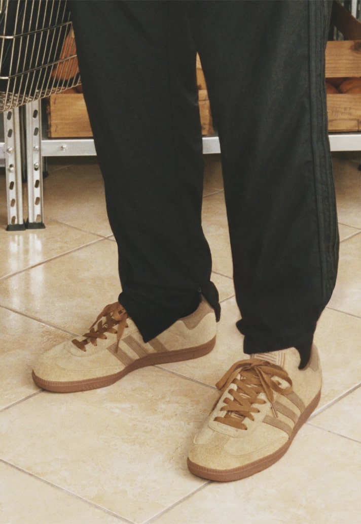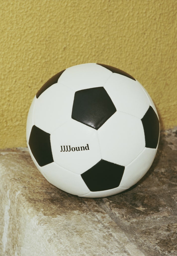 The collection is headlined by the next iteration of the JJJJound Samba, which is made up in a tonal khaki colourway with a hairy suede upper, matching tongue, and gum rubber outsole. The apparel selection, elevated and expertly designed, includes an all black track top and matching pair of track pants, a tonal white jersey, and a black airliner bag, as well as a co-branded football and bag set. includes an all black track top and matching pair of track pants, a tonal white jersey, and a black airliner bag, as well as a co-branded football and bag set.
