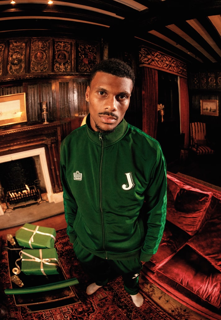 The tracksuit pulls from Admiral’s rich archive of pre-match garms and features key elements like the iconic side taping and stitched Admiral logo adding the Jameson J on both the front chest and the taping. A slouchy royal green trackie ready prepped for pubs, presents, party games and freezing cold five-a-sides this Xmas.