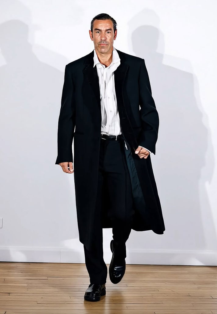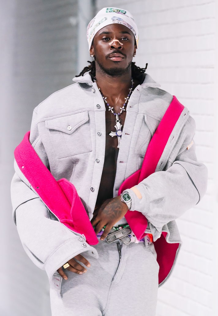 Cissé wore an oversized black two-piece suit paired with black adidas boots, a subtle base to keep all focus on the statement piece. A full-length orange puffer turned heads with a design inspired by Japanese art design Suiboku-ga, featuring orange blotches printed across. A forward-thinking Japanese design with a touch of Arsene Wenger touchline fit.