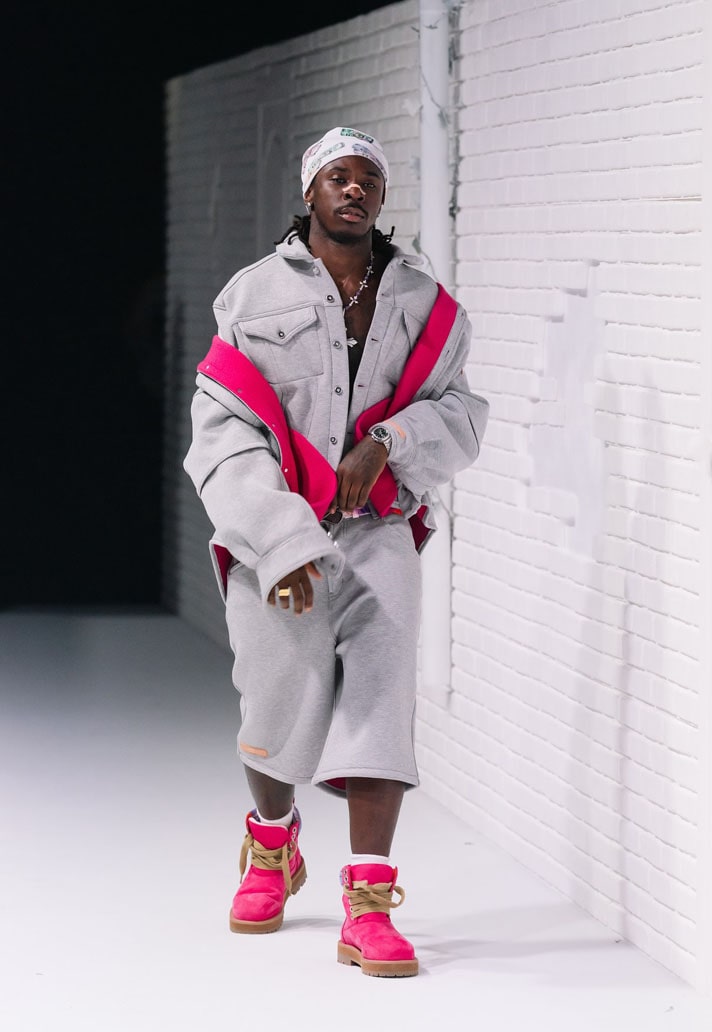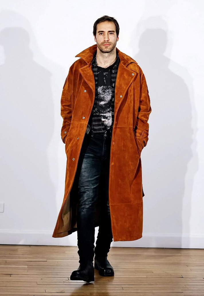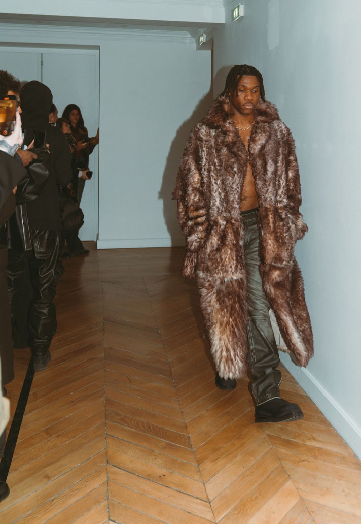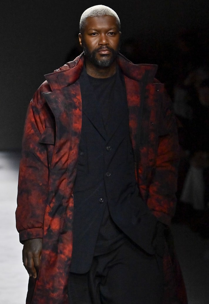 Cissé wore an oversized black two-piece suit paired with black adidas boots, a subtle base to keep all focus on the statement piece. A full-length orange puffer turned heads with a design inspired by Japanese art design Suiboku-ga, featuring orange blotches printed across. A forward-thinking Japanese design with a touch of Arsene Wenger touchline fit.
