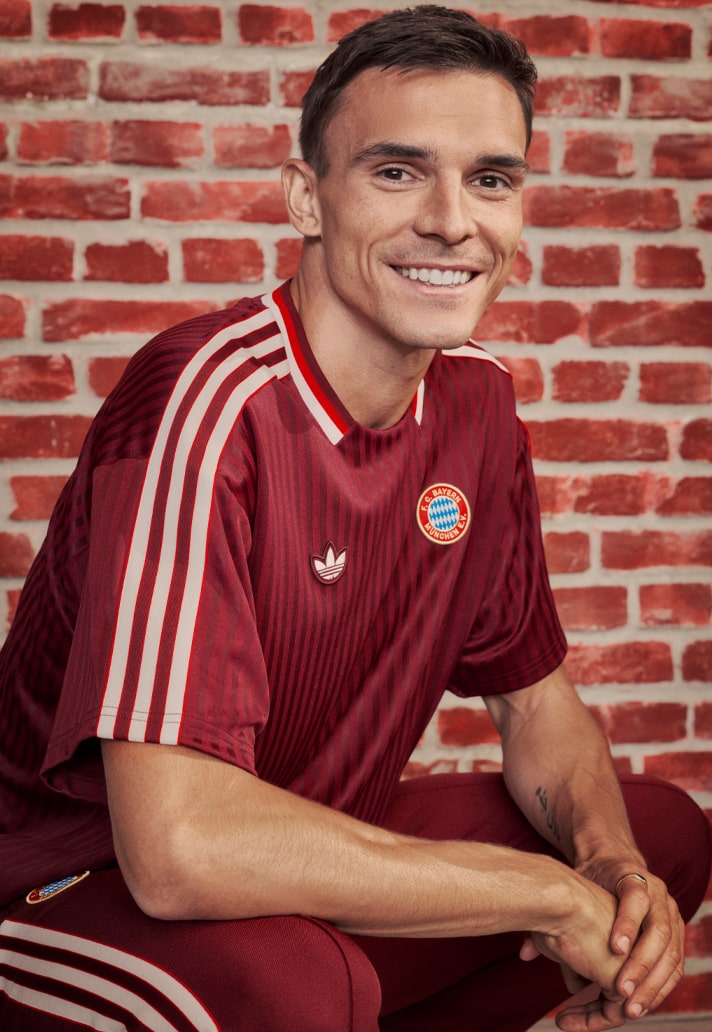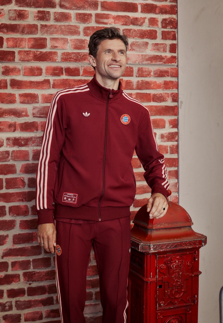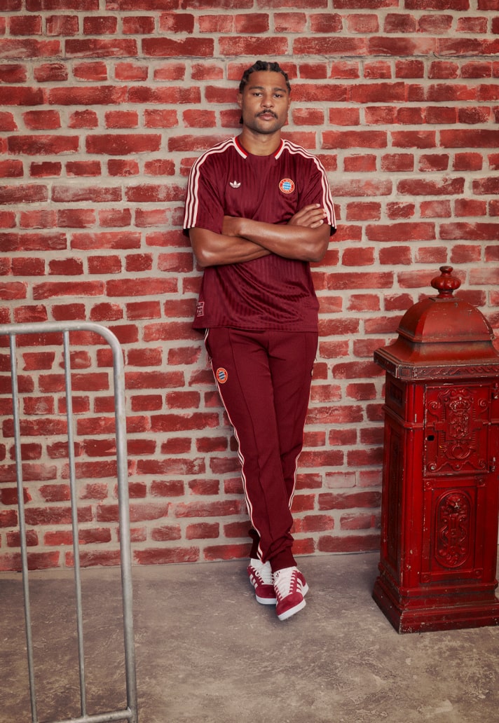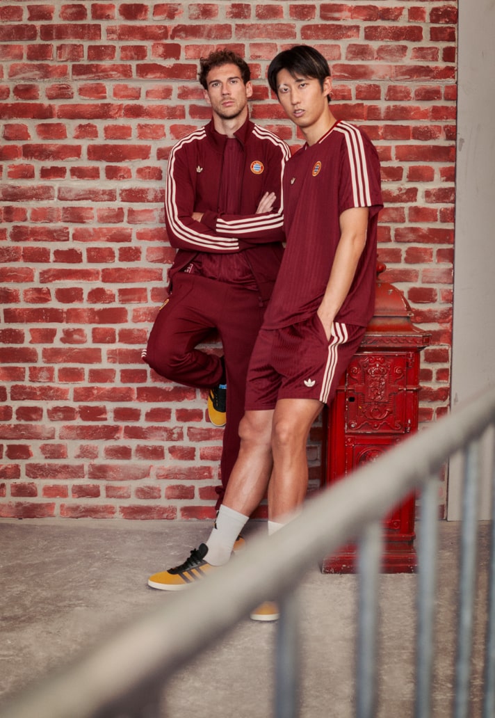 The whole collection is themed around a “Shadow Red” colour scheme, linking into the club’s heritage. Alongside the tracksuit comes a sleek tee, which features a subtle sublimated stripe design, combined with the branding in an off white. From the vintage FC Bayern badge and embroidered Trefoil to that woven label, it’s a full throwback, with the collection bolstered by further tees, hoodies, drill tops, shorts and more.
