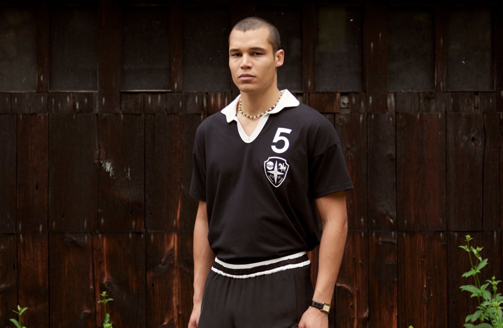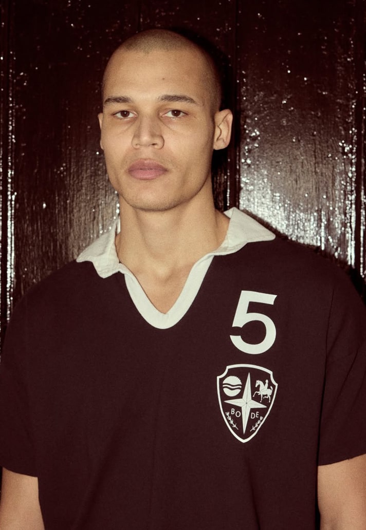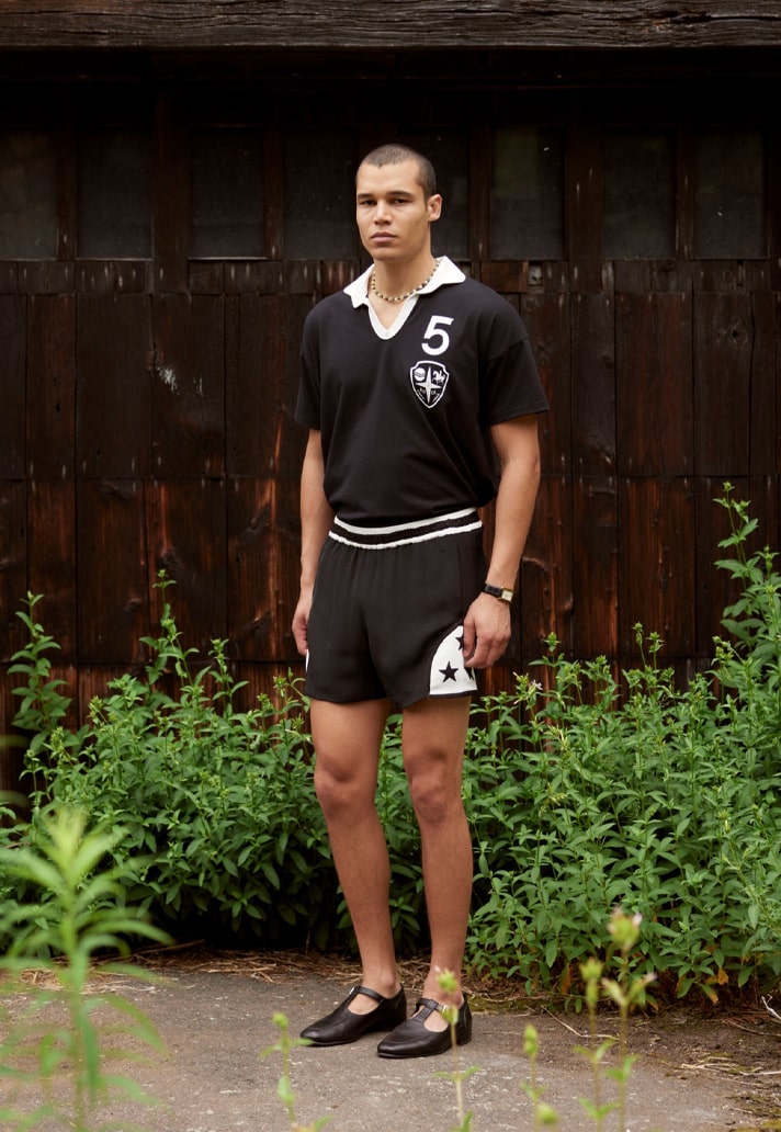 Stand out pieces from Bode Recreation II include a now-signature appliquéd Bode team jersey and shorts – an obvious nod to vintage football shirts from the 20th century. The jersey thrives in simplicity, arriving in a classic black complimented by a white fold-over collar and stooped neck line. Finished with the 'Bode crest' and number 5 printed on the chest.
