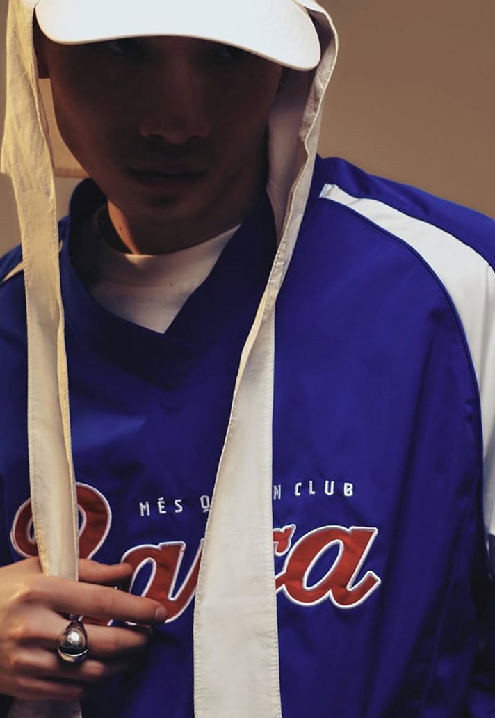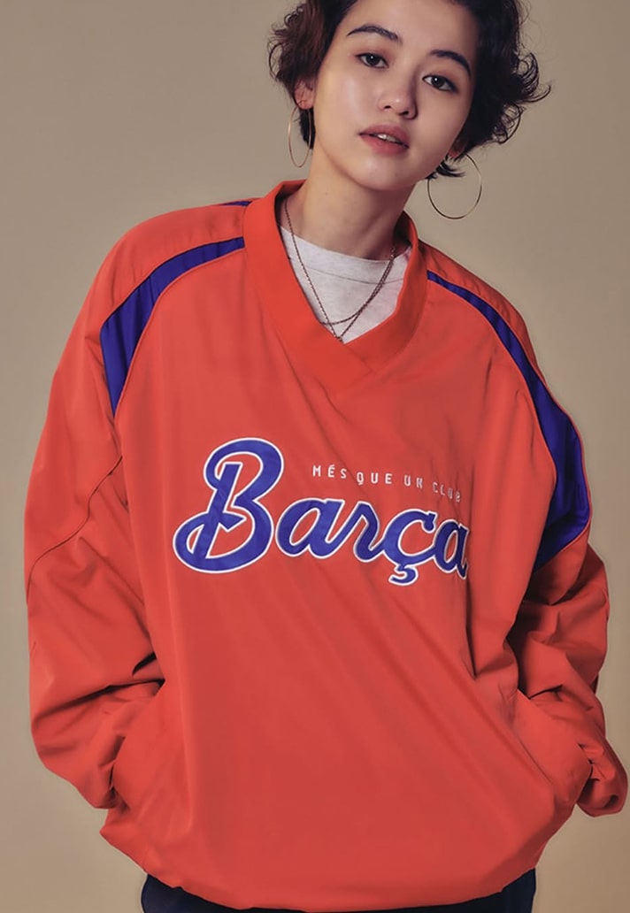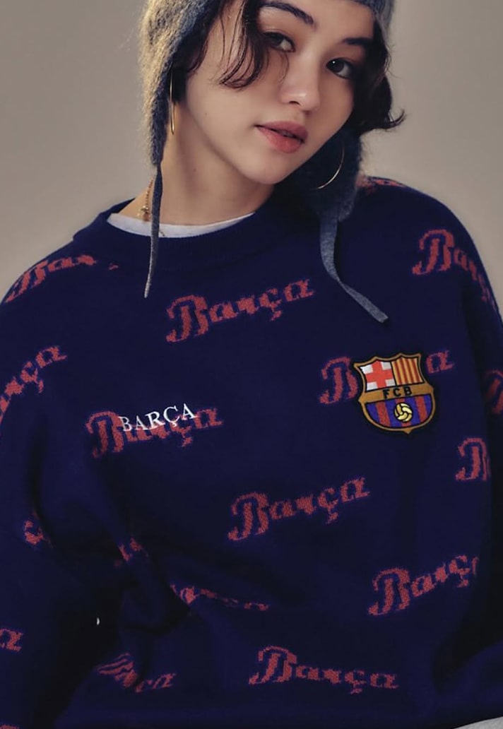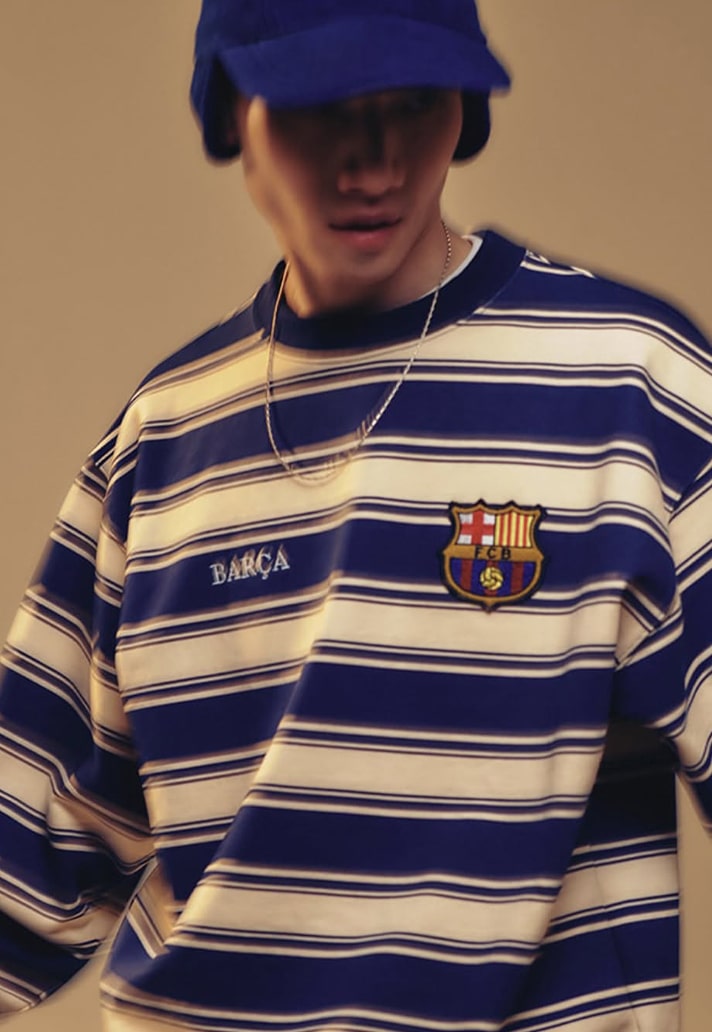 One of the standout pieces from the collection entails a striped crew neck sweatshirt, fashioned in a blue and white colour scheme. The sweatshirt adorns the FC Barcelona badge sitting next to the heart of the club’s fans, partnered with a custom ‘Barça’ logo on the other side of the chest. This piece collects inspiration from both the club’s culture, and Yen Town Market’s taste for contemporary fashion, helping to establish stronger bridges between the football and fashion markets.