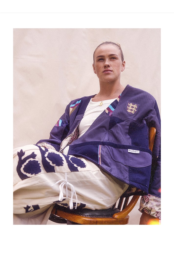 At the heart of this striking new collection is Grace Clinton, Manchester United and England’s rising midfield maestro, fronting a capsule that’s as much about identity as it is about football. Alongside amateur footballers Talia D and Verena Camesasca, Clinton has co-designed a limited run of upcycled garments that are deeply personal, created in collaboration with Ed Sonnex, Creative Director and Founder at Slow Projects.