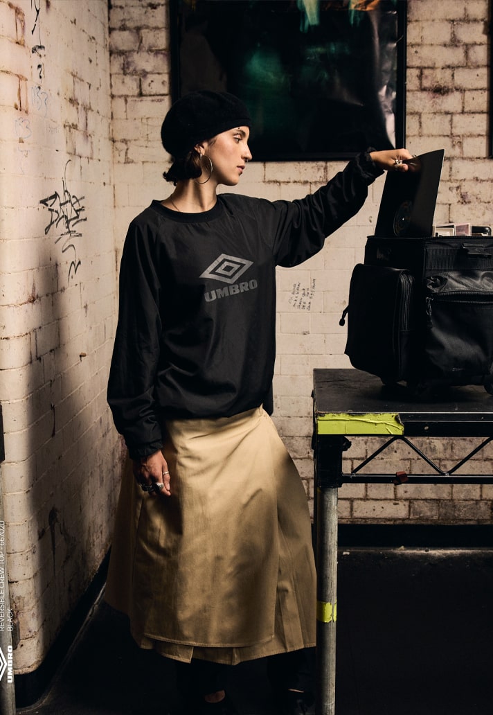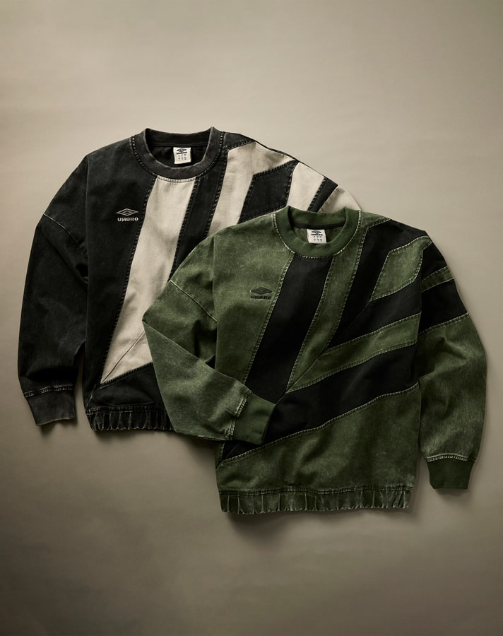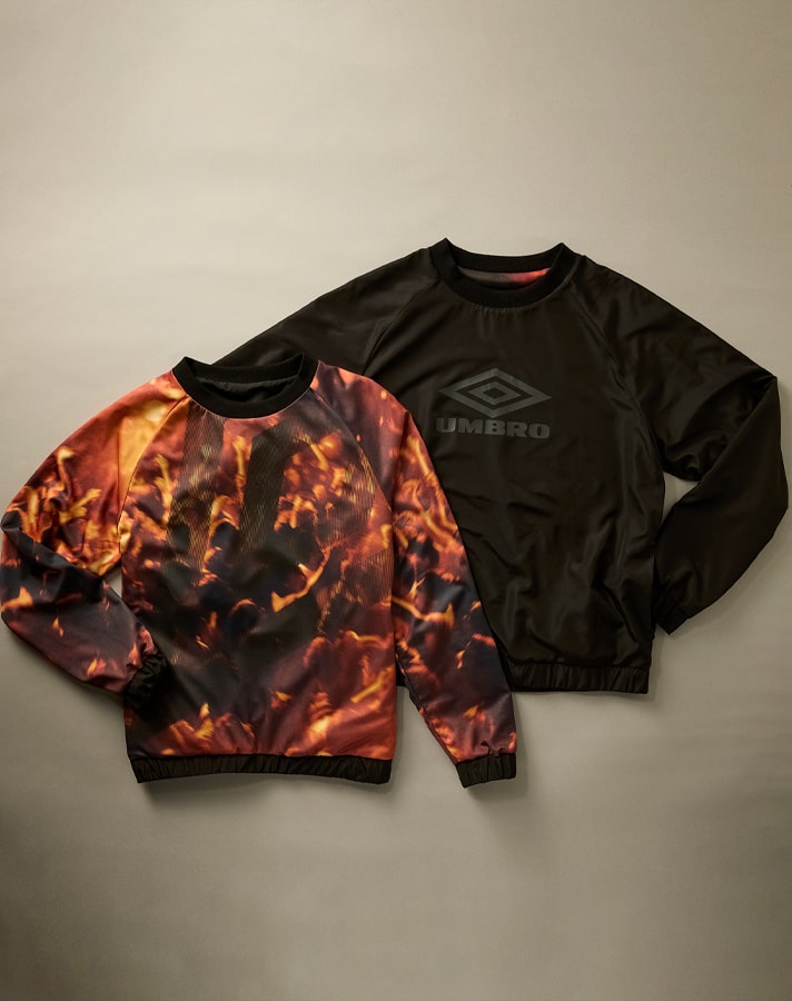 The collection itself feels like a remix of past and present. Drawing on Umbro’s rich archive and footballing DNA, AW25 reimagines classic silhouettes through a contemporary lens, building a design-savvy suite of casual, sports-inspired streetwear. The standout piece is the Reversible Crew Top – a split-personality garment that sums up the Northern Quarter’s unique duality. One side nods to clean, lightweight training gear, while the reverse flips into full ‘club night’ mode, complete with striking graphics that bring energy to the after-dark setting.