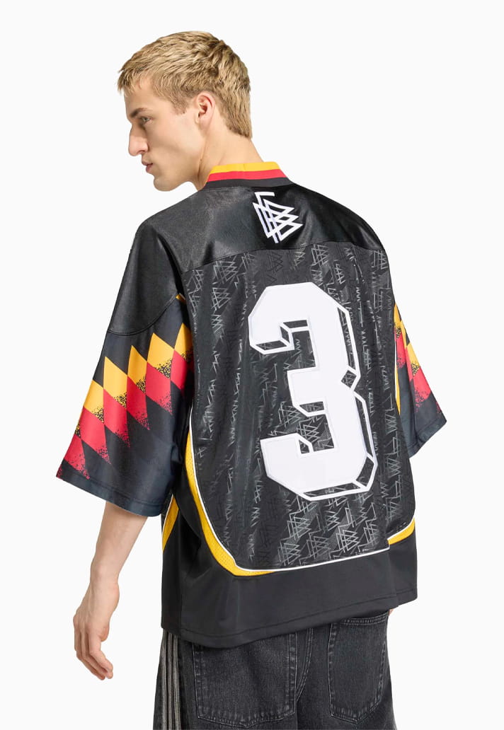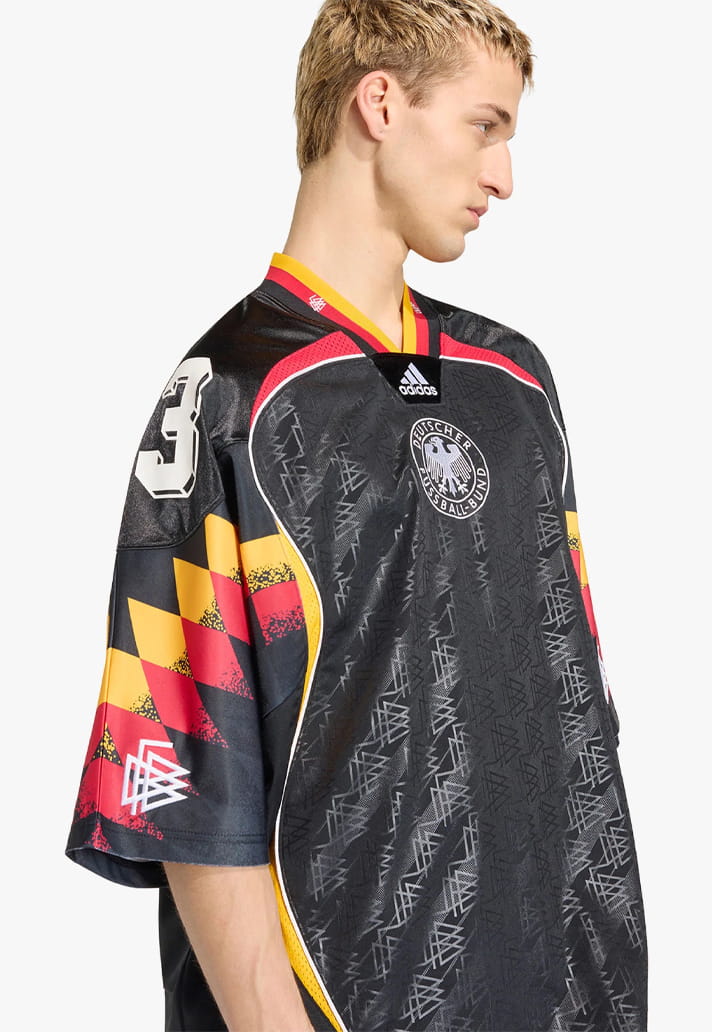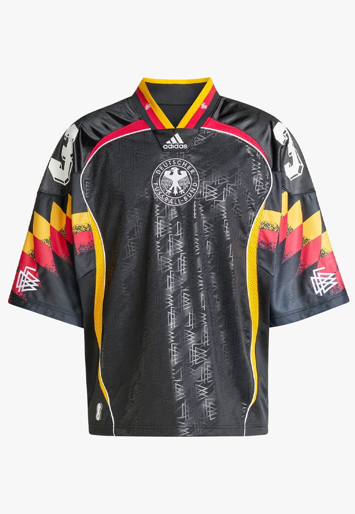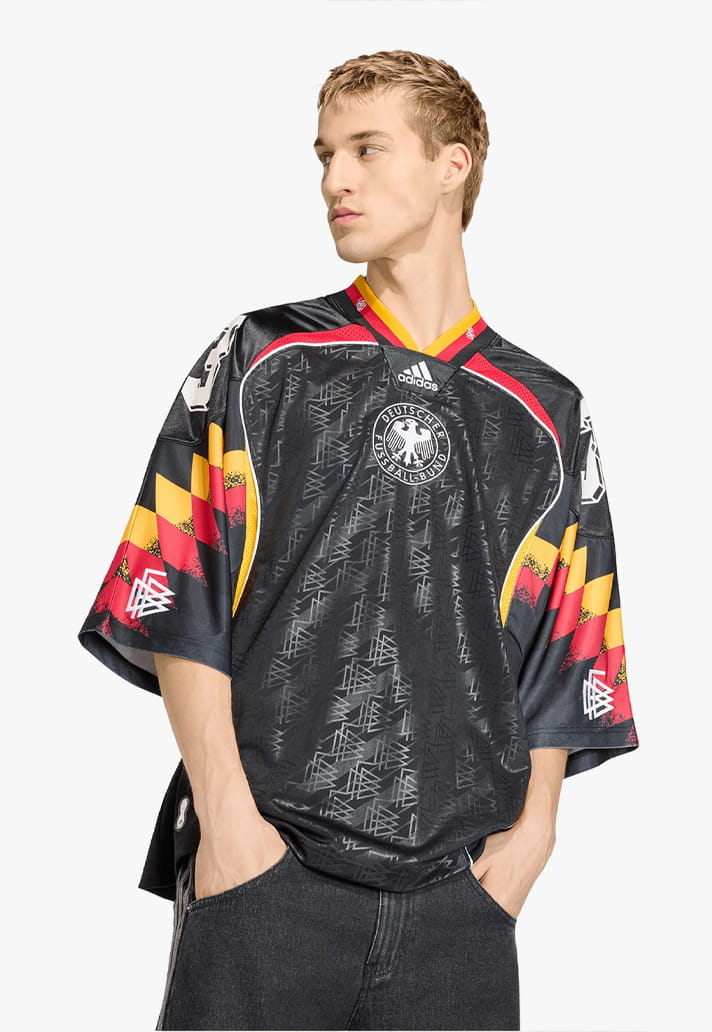 Germany’s jersey is arguably the boldest of the bunch. A mash-up of the unforgettable 1994 away kit and the 2006 Teamgeist template, it lands on a black base with geometric patterns tearing across the sleeves. It’s daring, disruptive, and easily one of the most adventurous designs adidas have ever produced for Die Mannschaft.
