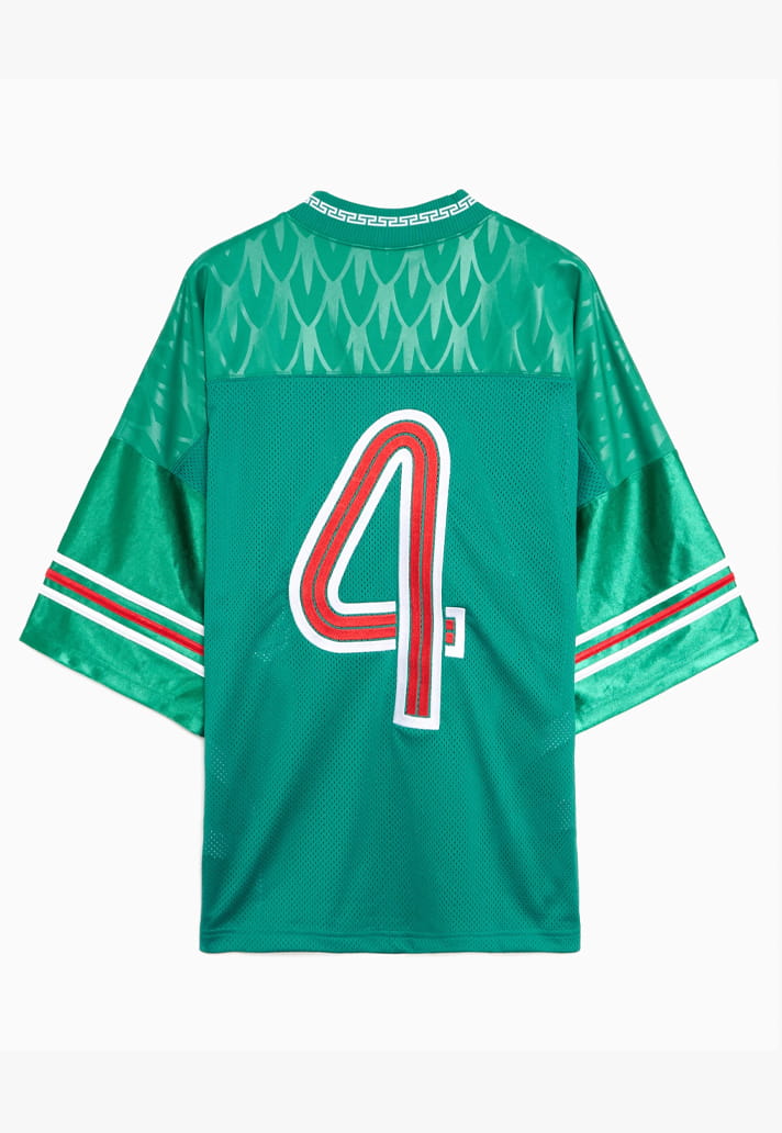 Mexico round things off with a rich green base that pulls from multiple eras. “México” sits proudly across the chest in a classic Gothic font, while the collar features an Aztec-inspired pattern that roots the design firmly in heritage. It’s bold, cultural, and built to turn heads well beyond matchday.