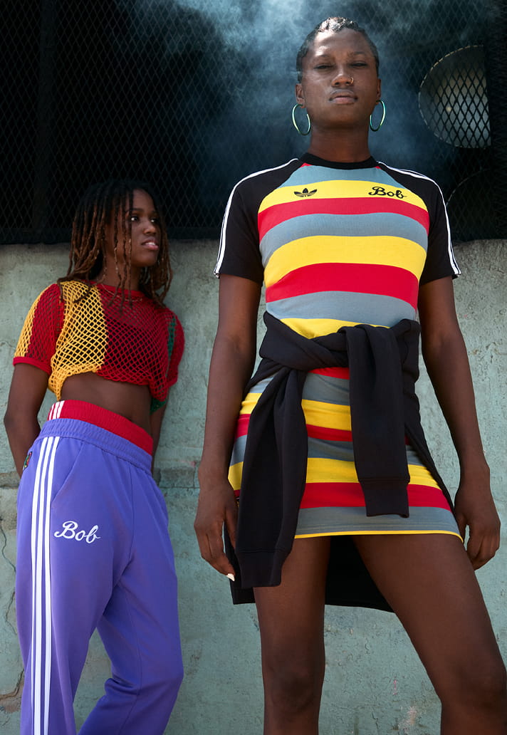 The rest of the range broadens the palette while staying firmly rooted in Marley's world. A striped dress and matching tee run in green, gold and red — colours forever tied to Marley’s legacy — while red shorts carry the collection’s signature wave pattern. Two sets of crew socks and a brown‑and‑white adidas bowler bag cap off the offering, the latter feeling like an instant cult accessory. Every item is unified by a subtle but significant detail: the adidas Originals trefoil on one side, the word “Bob” embroidered opposite in flowing calligraphy. It's a quiet handshake between brand and legend.