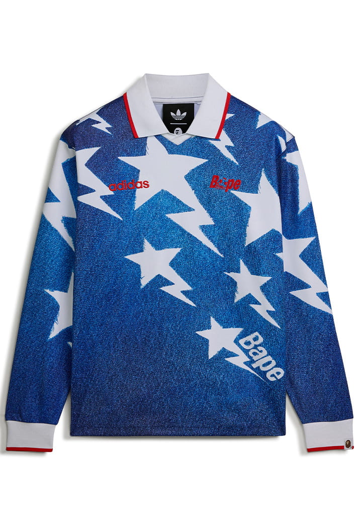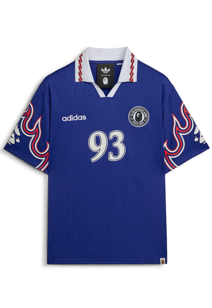 Front and centre are two jerseys that refuse to play it safe. One lands as a long sleeve, denim-print collared top that takes clear inspiration from the iconic star-stamped USA ‘94 away shirt, this time blended with that fearless BAPE design language. The other jersey flips an iconic 90s Japan shirt, setting BAPE flame graphics loose down the sleeves and across the back, & finished with BAPE 93 personalisation that sends a clean nod to where it all started. It’s the perfect fusion where football heritage meets the streets.