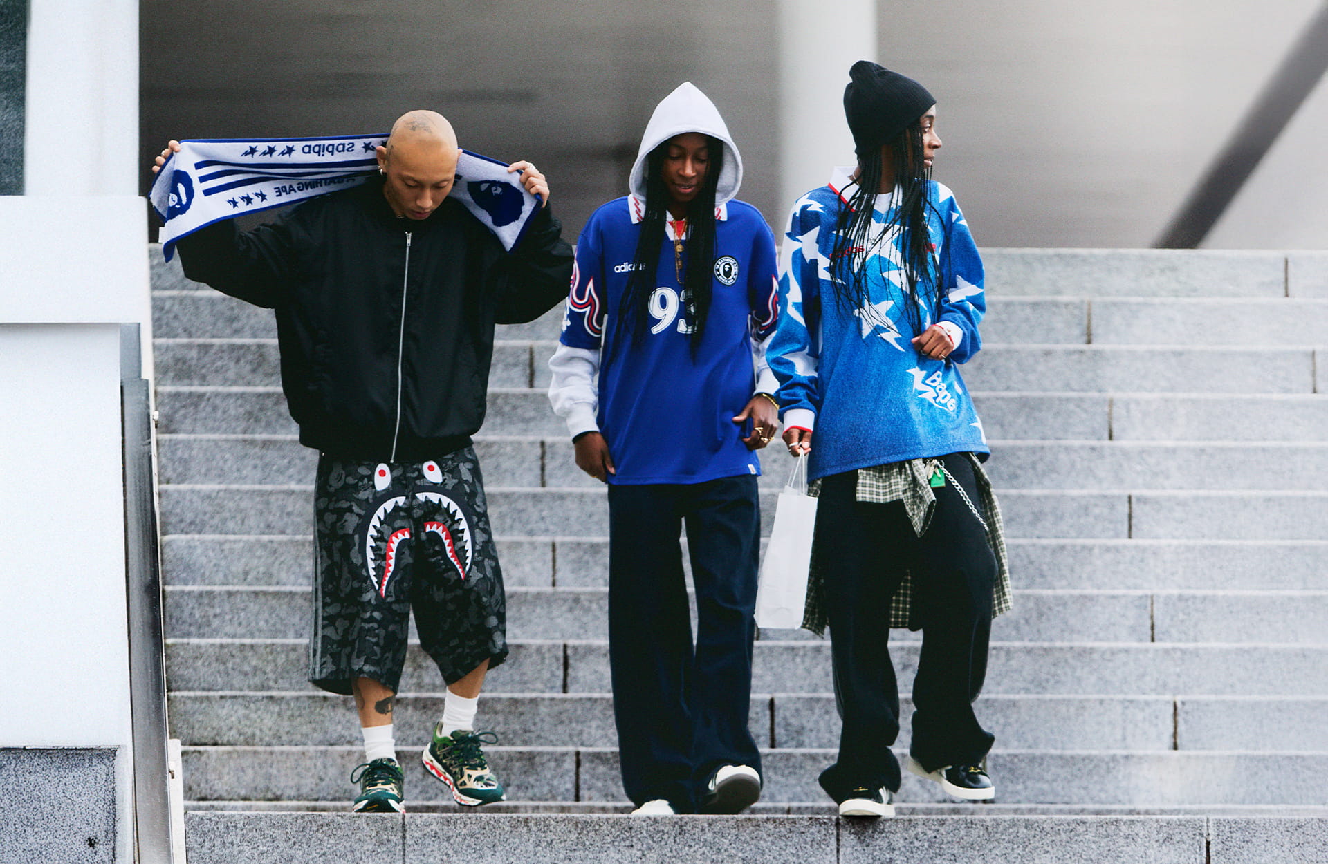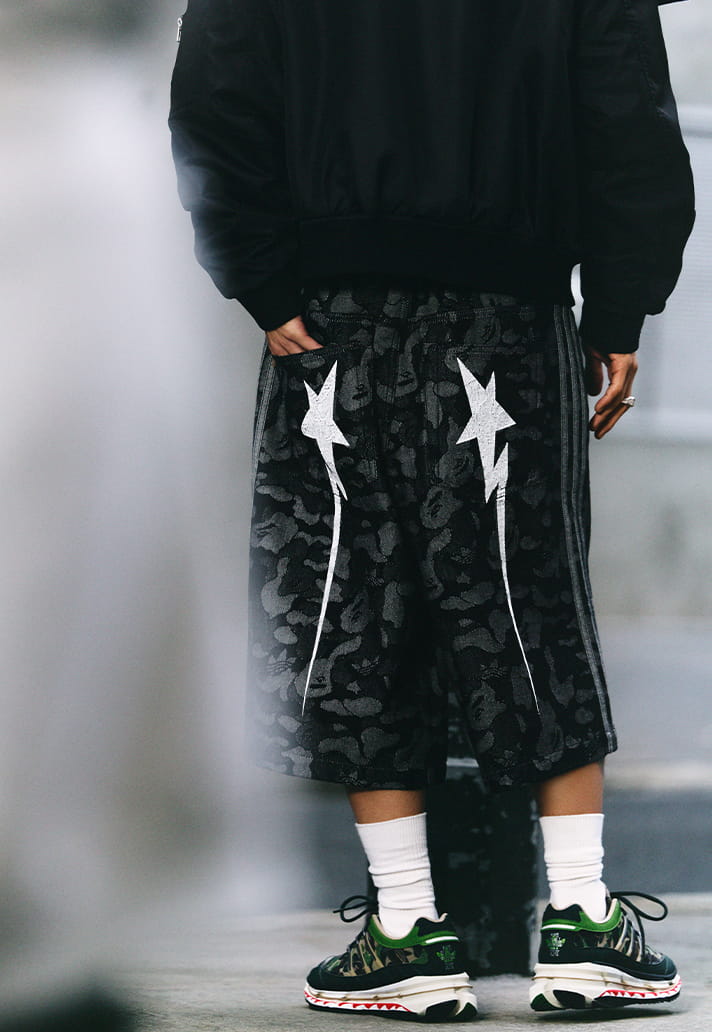 And the rest of the drop is no joke either. Shark hoodies, camo jacquard Joe’s, parachute pants, and graphic tees build out a rotation that feels made for football fashion fans. Then there’s the footwear, that doesn’t miss either. Class adidas silhouettes painted with bold camo graphics that are instantly recognisable as BAPE looks. Clean.