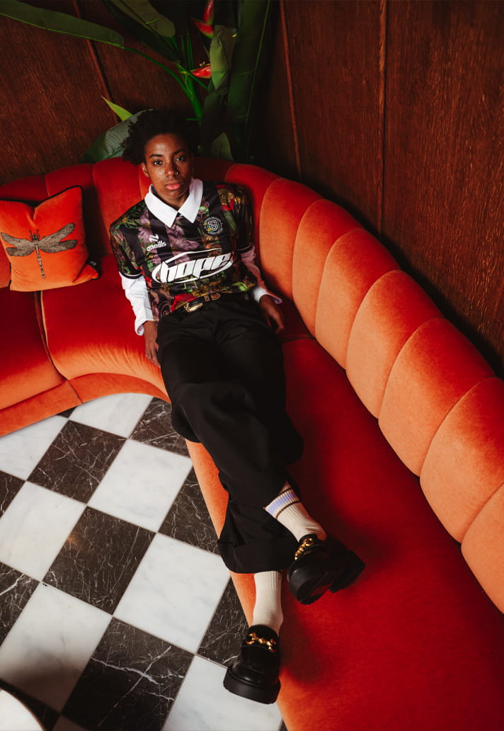 The floral Street Soccer crest, crisp white-and-navy collar, and embroidered Timorous Beasties hem tag elevate the piece beyond apparel. It’s statement design with intent. A jersey that doesn’t need a pitch to justify its existence.