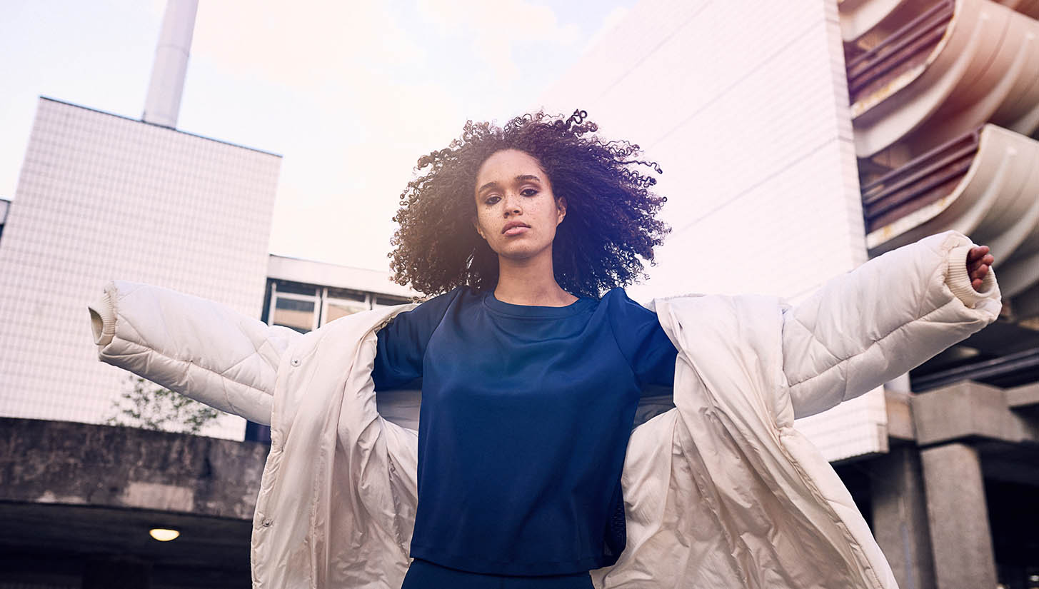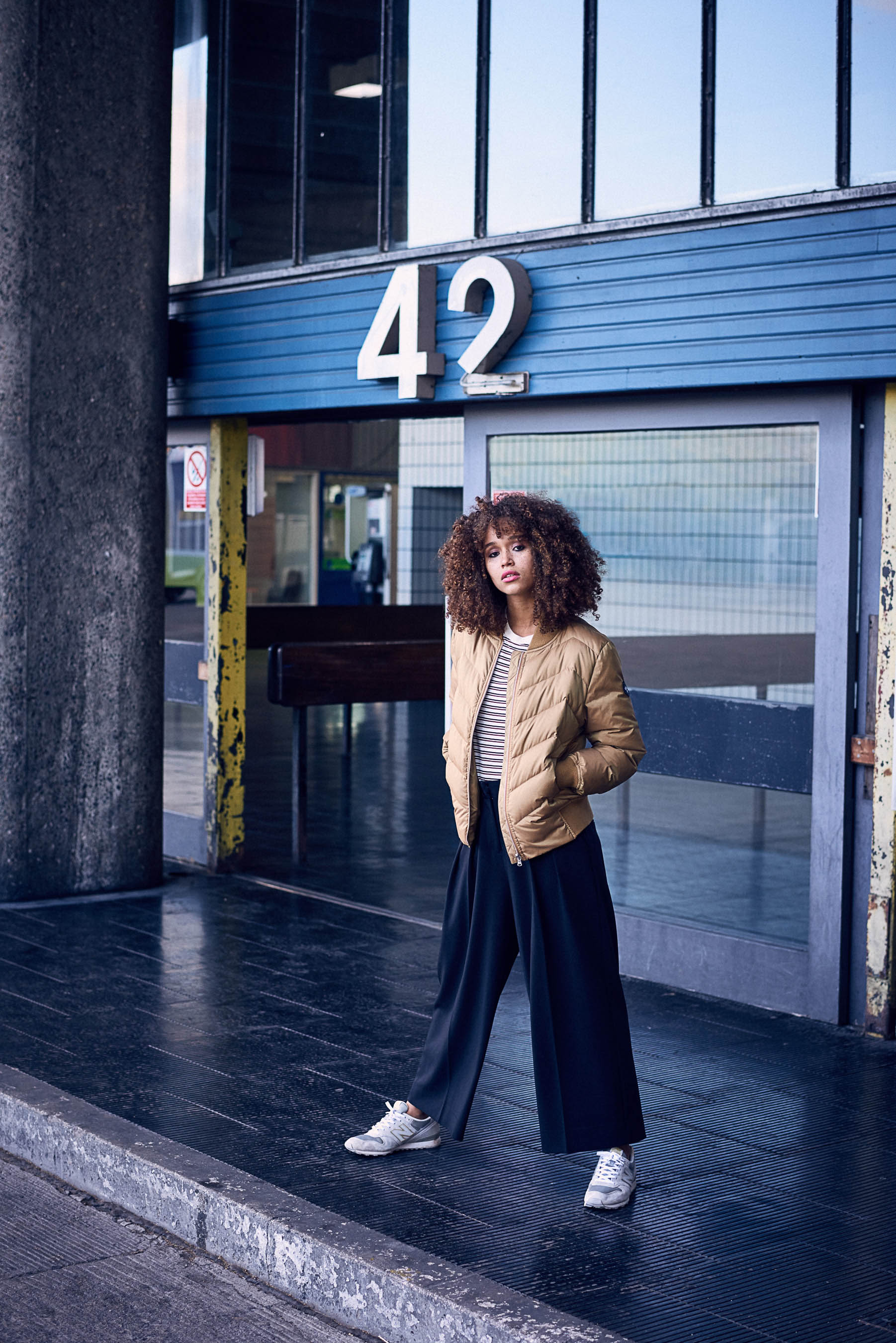 Wood Wood Tee. Puffa Jacket. Cullottes by Samsoe + Samsoe. New Balance 574 Rose Gold.