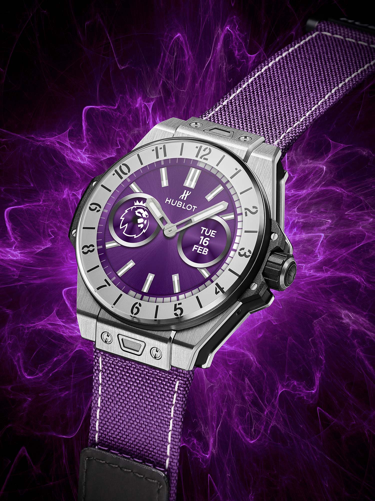 The strap, which is available in the Premier League’s signature purple, can be quickly changed by the owner thanks to Hublot’s ingenious One Click strap-change system. Every strap comes with a microblasted black ceramic buckle. Inviting a swift change in style, owners will be able to change the look of the watch easily by choosing rubber strap colours and dial configurations.