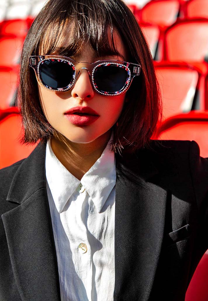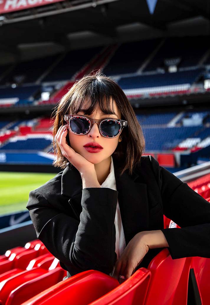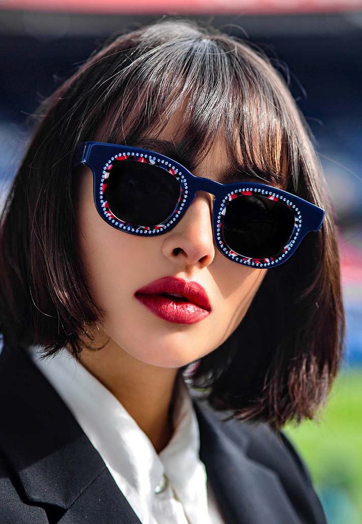 The collection sees two models, one with a classic solid lens, the other with Swarovski crystals around the rims, and for the design Lasry leveraged Italian label Mazzucchelli to use an exclusive material that uses the traditional red, blue and white colours of PSG. Hand-made in France, each frame combines blocks of acetate and is completed with an eye-catching, yet tasteful pattern.