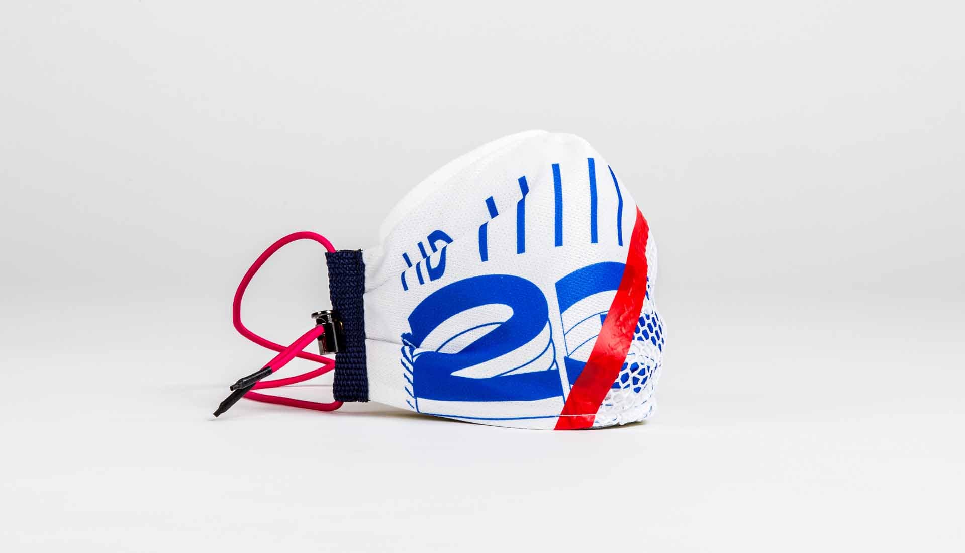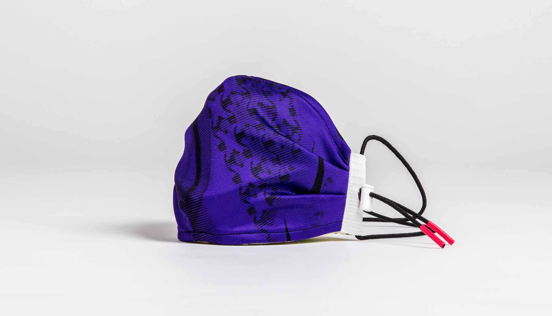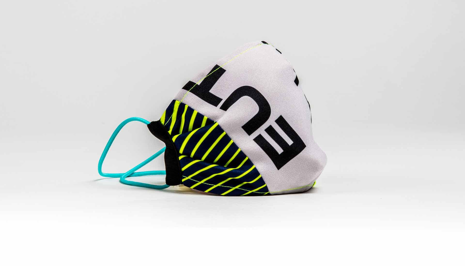 Measuring 24 x 12 cm with adjustable straps and additional string ties, every mask is unique and is optimised for use on public transport with anti-facial recognition technology. They also come presented in an exclusive jersey bag.