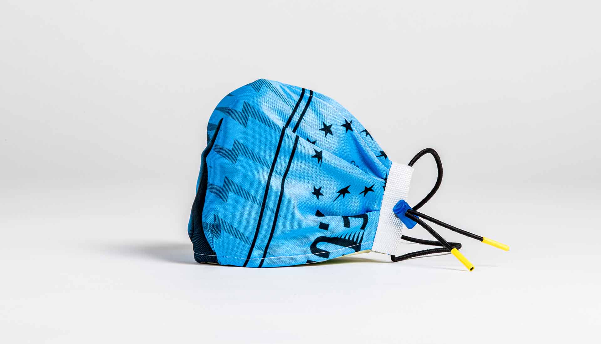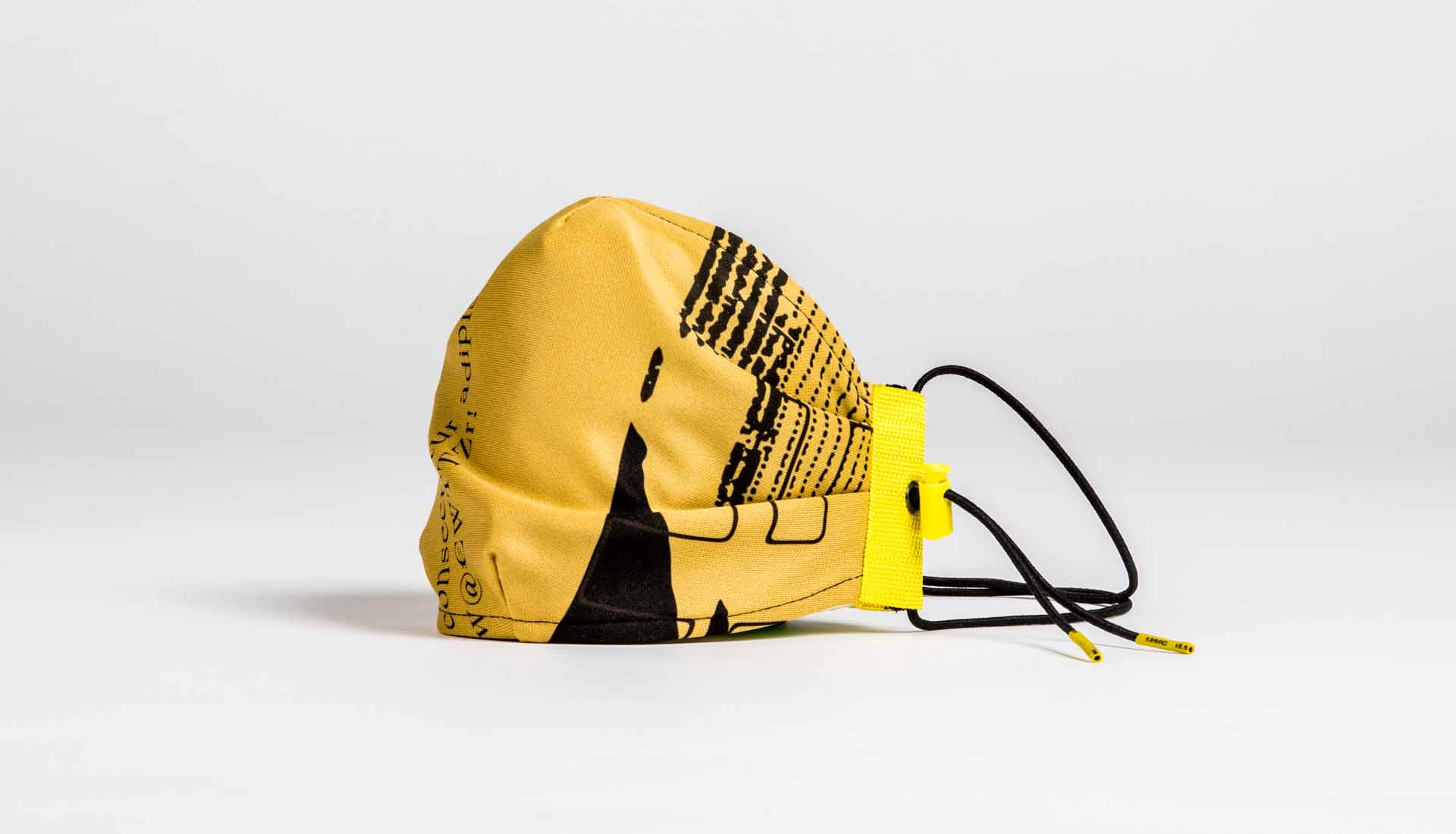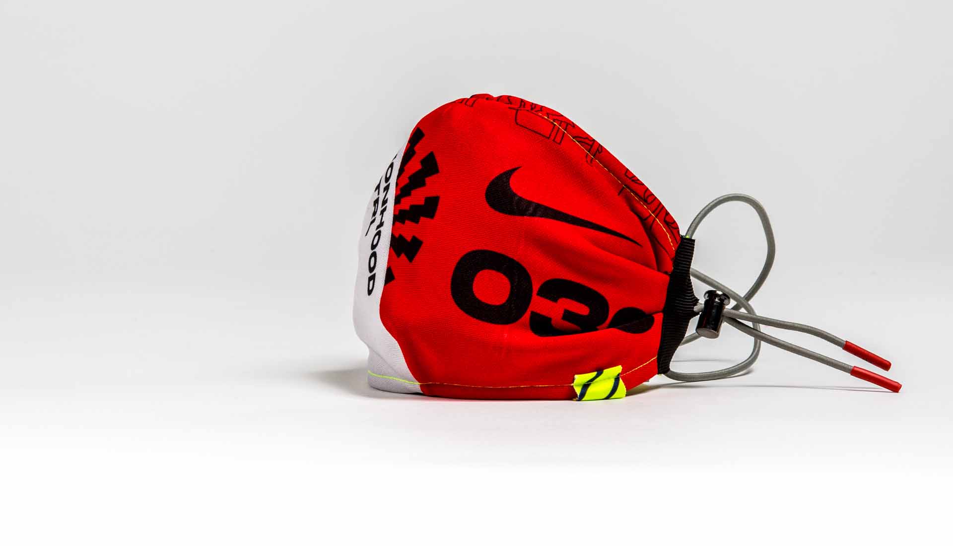 Measuring 24 x 12 cm with adjustable straps and additional string ties, every mask is unique and is optimised for use on public transport with anti-facial recognition technology. They also come presented in an exclusive jersey bag.