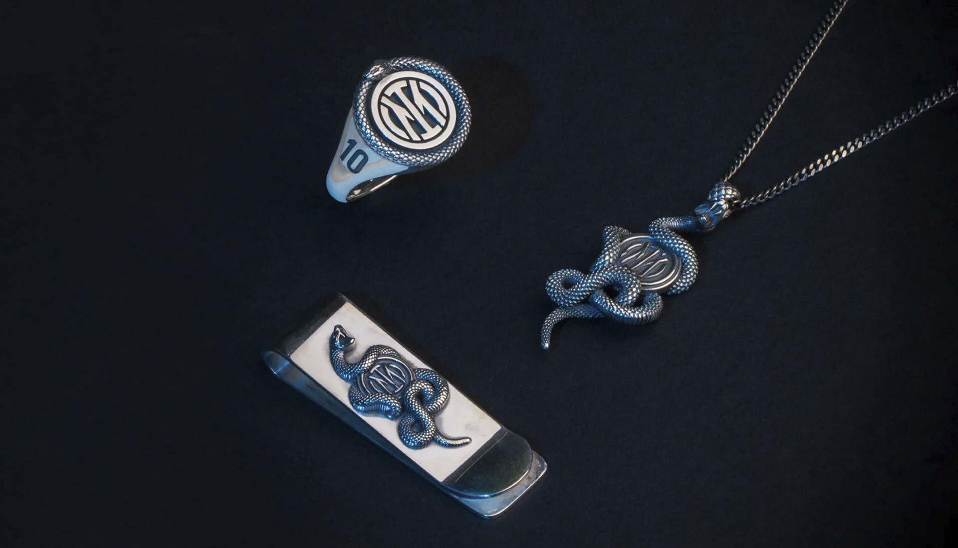 Placing the iconic Nerazzurri snake at the heart of all the pieces, the collection features seven products in total, with five pieces of jewellery (earrings, a necklace, a chevalier ring bracelet and a money clip) lining up alongside two design objects (banknote holder and a paperweight).