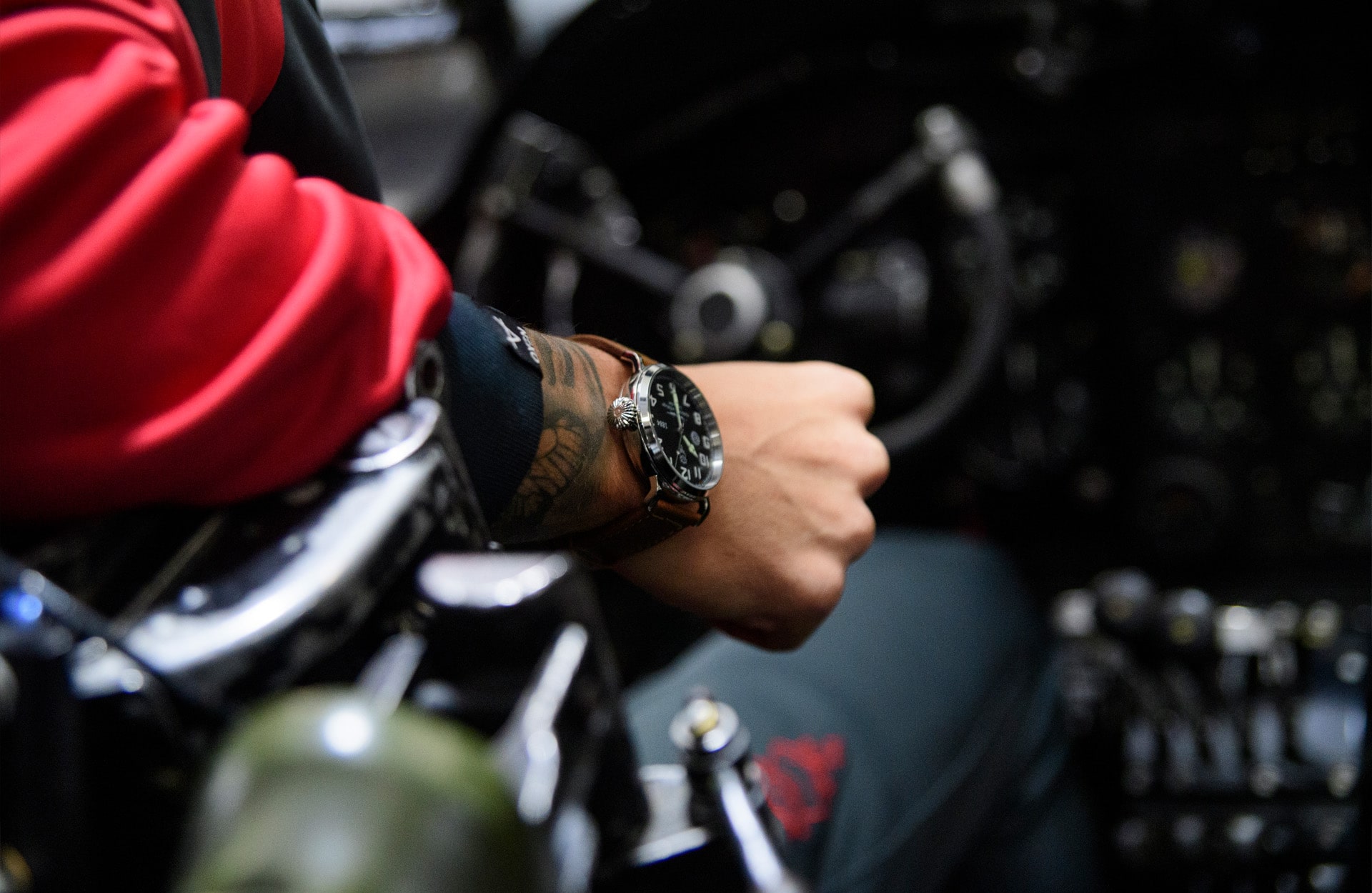 To promote the watch, Lincoln's Lewis Montsma was shot with the iconic plane by club photographer, Chris Vaughan, even getting to take a seat behind the famous controls.