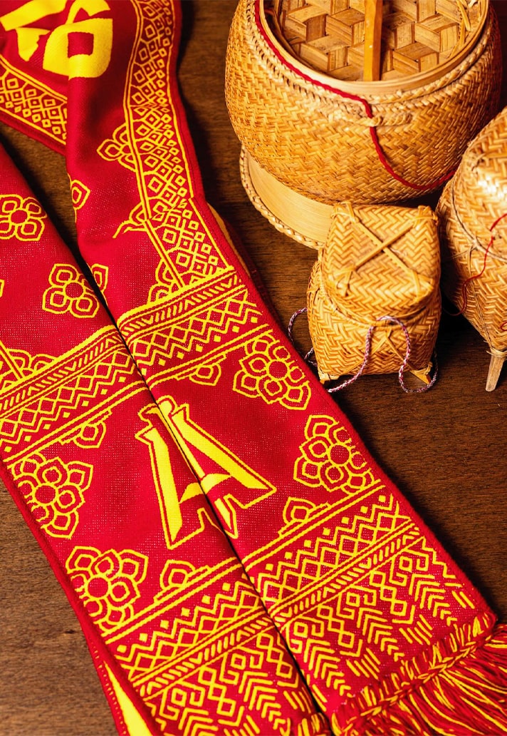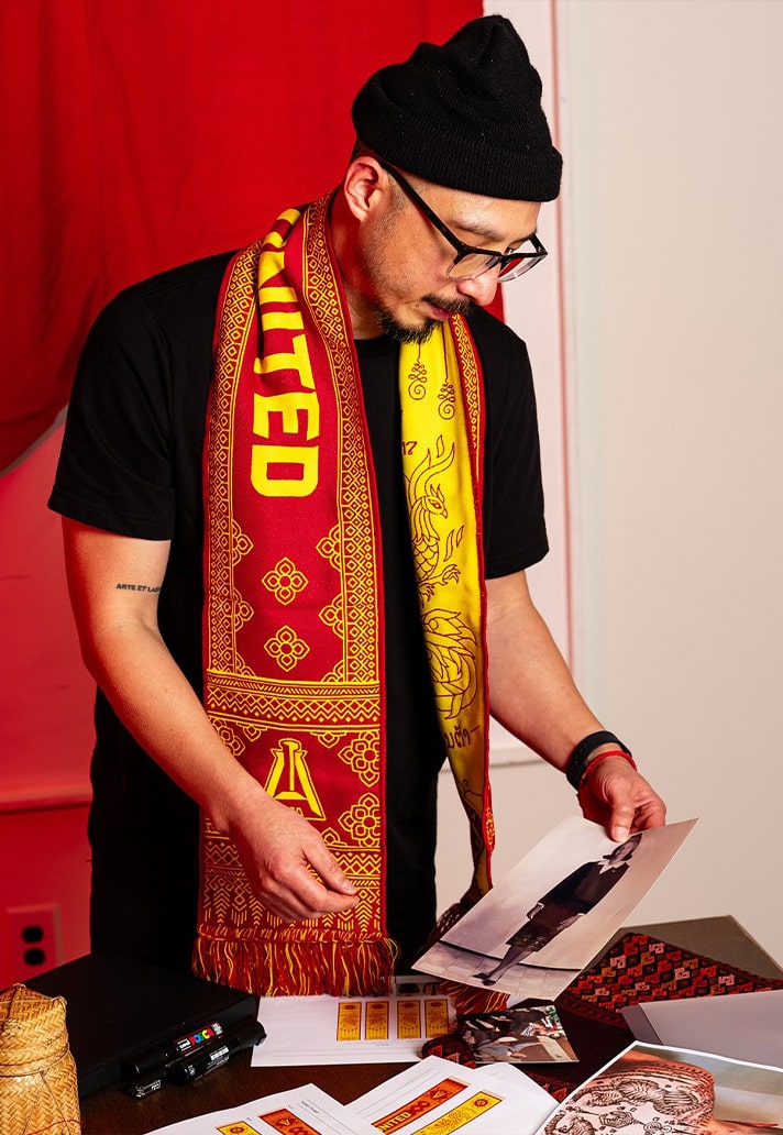 This isn’t just merch. It’s meaningful art. It’s Phansavanh’s signature style — a blend of traditional motifs and contemporary design language — put to powerful use. Known for his large-scale murals and precise pencil work, Sanithna’s art lives in public spaces, galleries, and now, across the shoulders of supporters in the Five Stripes’ faithful.