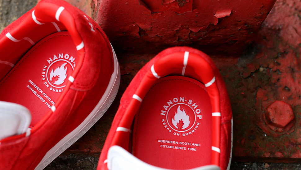 Hanon write, "Working closely with the original Italian factory allowed us to utilize the same premium material treatments as Diadora once applied to their legendary court shoes and football boots during the ’80’s. We have spec’d the shoe up as much possible and included a laminated kangaroo leather tongue with a plush backer, as well as a double layered stitched leather insole. Dual branding features throughout – embossed and printed on each back- tab and tongue, whilst our Keeps On Burning fire emblem and 83 are detailed on opposing heels."