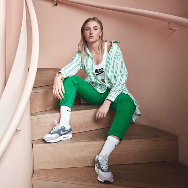 Arsenal player Leah Williamson was Air Force 1 from day dot, "My younger brother and I always used to have matching Air Force picked by our mum. He was just a toddler then so people must have thought we were a fashionable family. Trainers are a huge part of the London lifestyle. The urban roots of the Air Force have been merged with the culture of fashion in the city — it's the style capital! That inch of a sole gives you a platform to stamp your ground and be accounted for. It’s not to be worn without a bit of attitude and confidence — certainly not something London is lacking. For me, it's the ultimate shoe. Today, my style is all about layering up with oversized or netted tops with flashes of color underneath and high-waist jeans or track bottoms. Those crisp whites give my look the classic status and sense of '90s nostalgia."