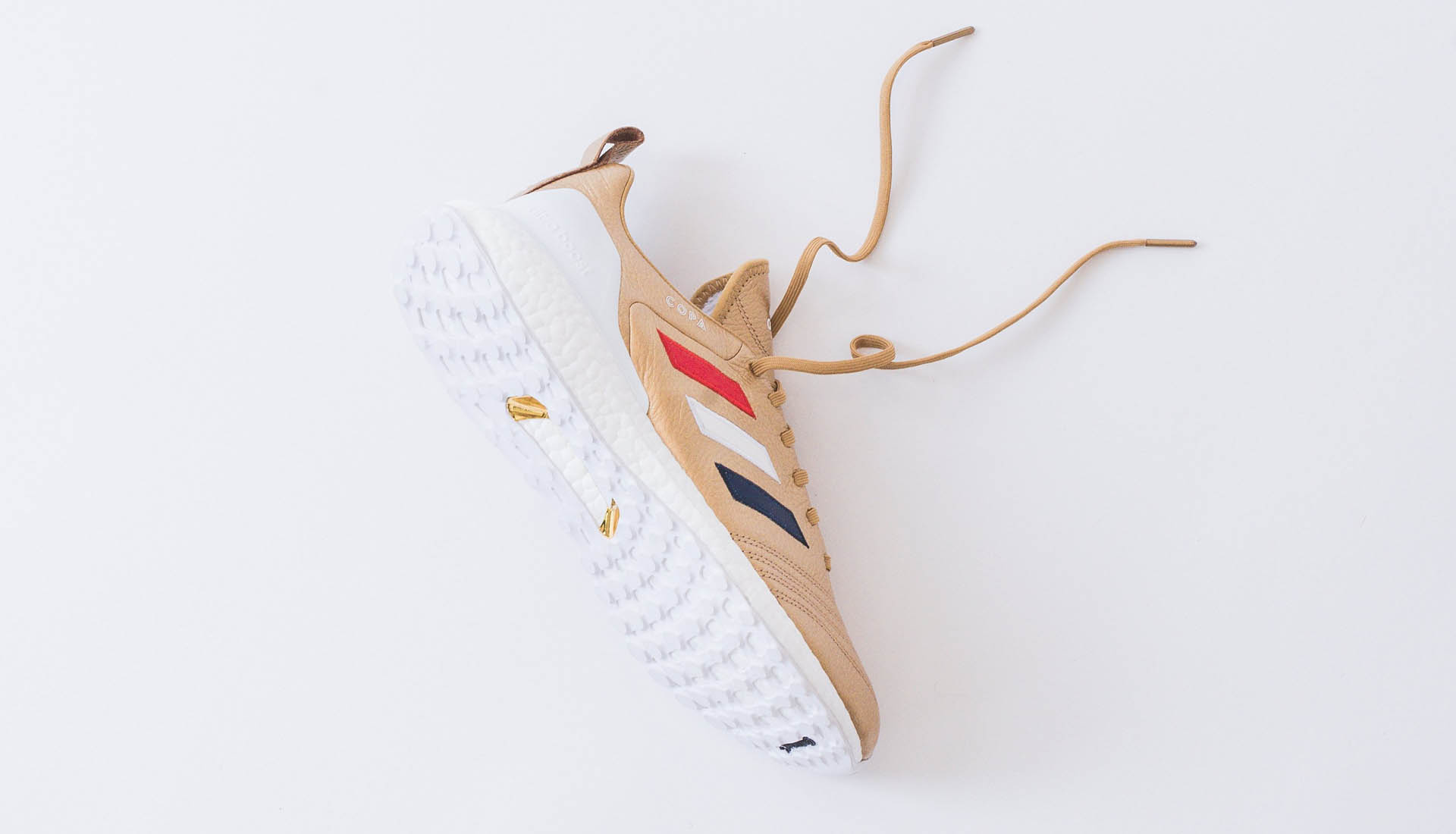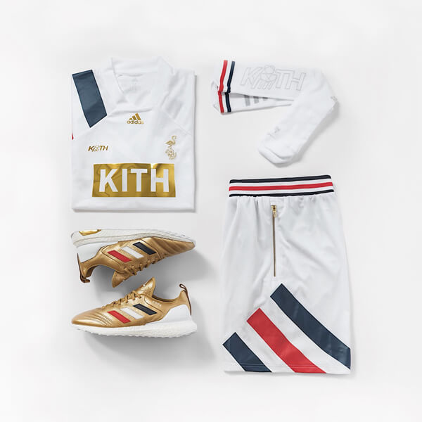 Taking a trusted trip back to the ACE 16+ silhouette, KITH have whipped up a multicoloured 4-yarn Primeknit upper for a design that leads the collection into a second successive World Cup tournament. Joining the ACE with lashings of distinguished style comes the COPA Mundial 18 UltraBOOST; wrapped in metallic gold leather and finished with red, white, and blue stripes. Both silhouettes are boxed in custom flag-inspired packaging.