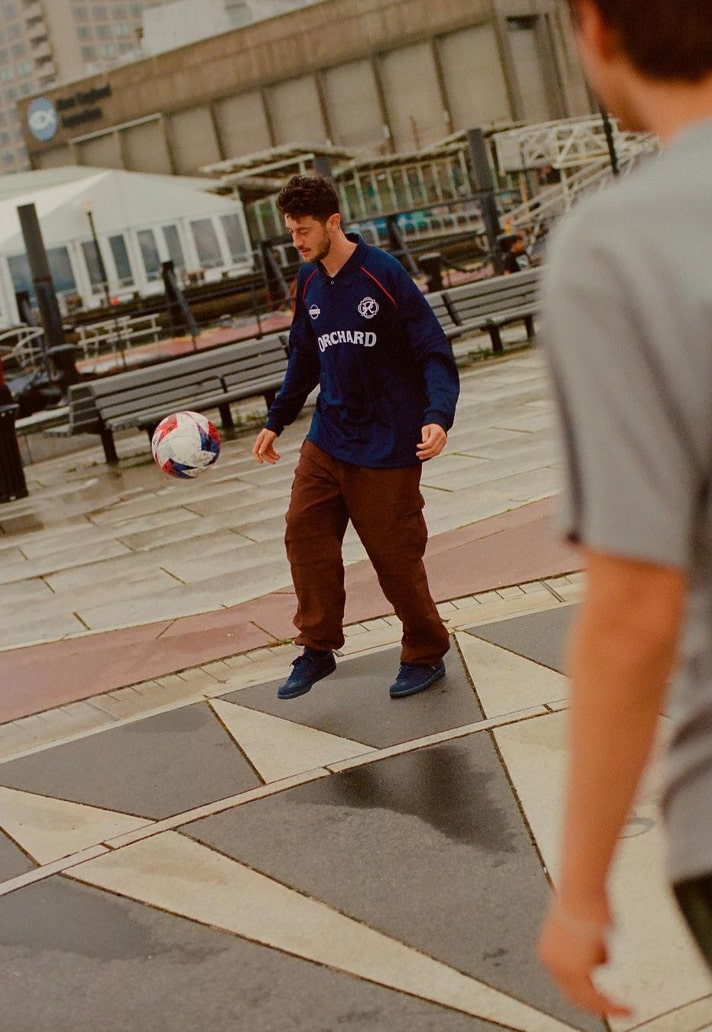 The accompanying Orchard x New England Revolution Jersey is constructed with recycled polyester and takes on a long sleeve design, matching the Samba’s indigo and red colouring. Orchard and New England Revolution branding appear prominently on the front.