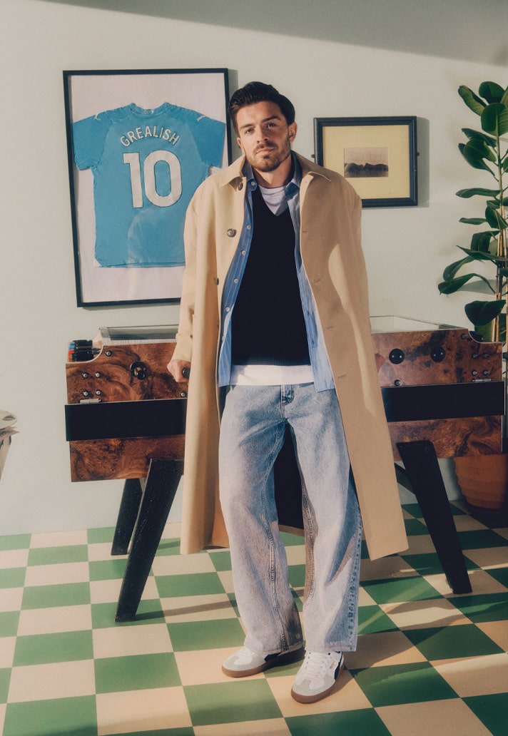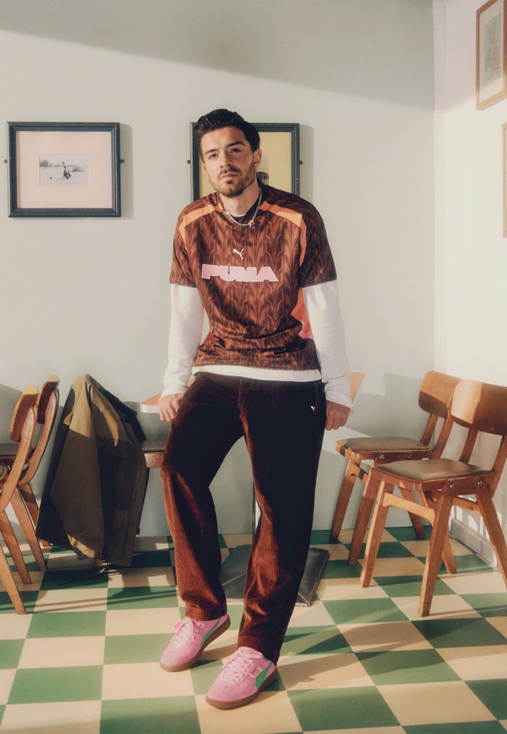 Grealish pairs the Palermo with a series of looks featuring classic light-washed denim and an oversized topcoat, in addition to a pitch-inspired look including a PUMA tricot and burgundy corduroy trousers.