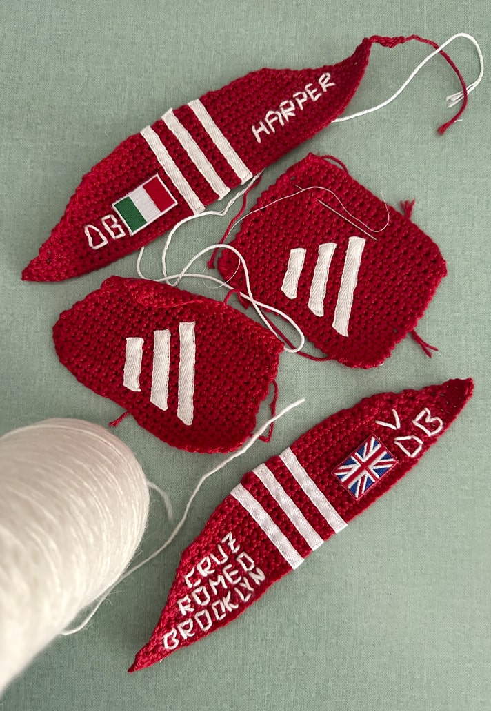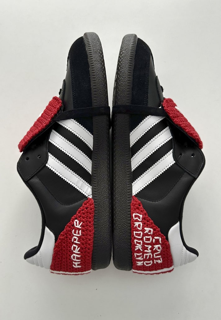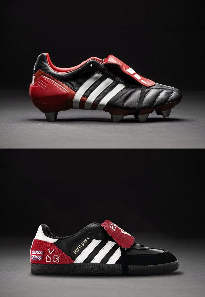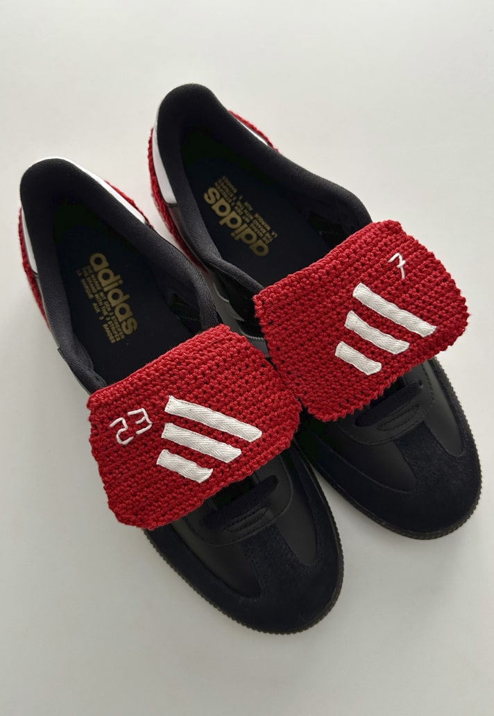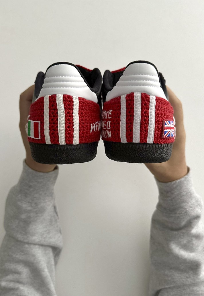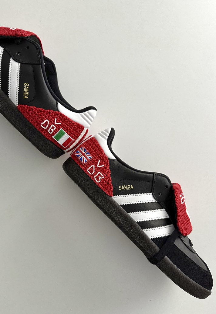 Through the use of handmade crochet and embroidery, the Samba Mania, as it has been dubbed, captures all elements of Beckham’s Predator Mania (red tongue, red heel with Three Stripes, elastic to hold the tongue down) and was further embellished with embroidery of the names of his four children, his and Victoria's initials, the Union Jack and Italian flags, and the numbers 7 and 23.