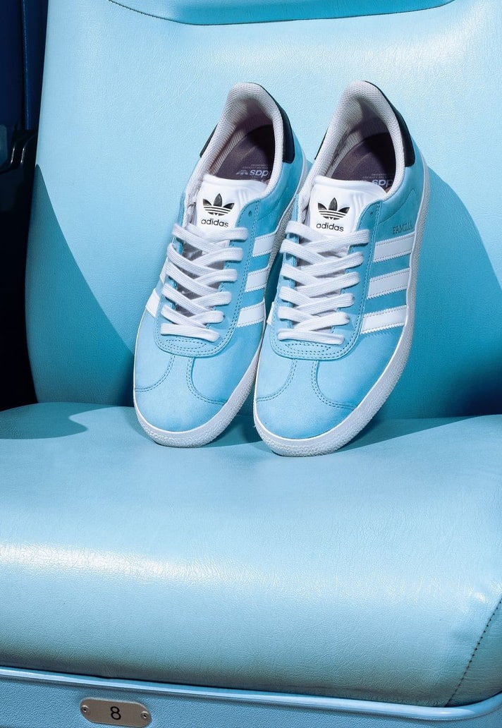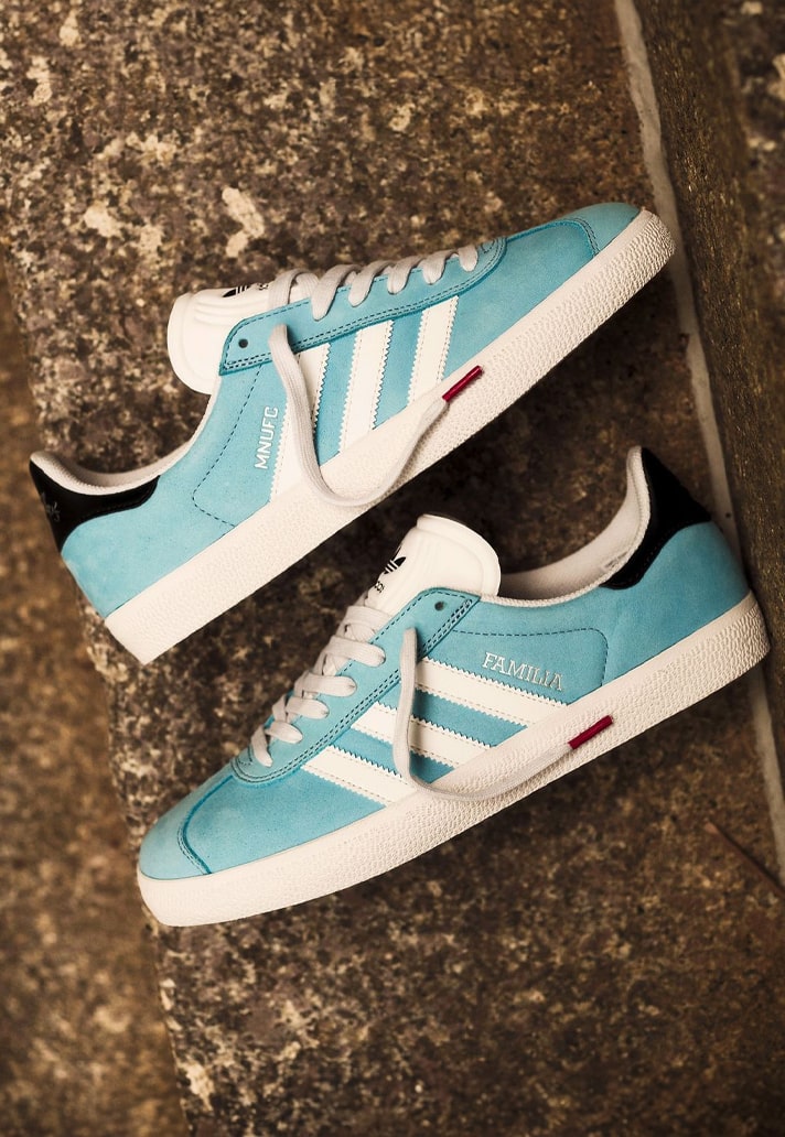 Minnesota skate brand Familia has an indoor skate park that is said to be one of the best in the Northern United States. It’s an integral part of what is a thriving skate scene in the region, and so this collaboration feels like a natural fit. The highlight of the drop is the Gazelle ADV, a skate version of the classic silhouette, which arrives in club colours with nubuck and suede detailing. Debossed “MNUFC” and “Familia” lettering sit on the right and left shoes respectively, running parallel to the traditionally positioned white Three Stripes. A ribbed white tongue is topped with a Trefoil logo in black, and that’s joined by a black leather heel tab featuring the stylised Familia branding. The insoles then feature dual Familia and adidas branding.