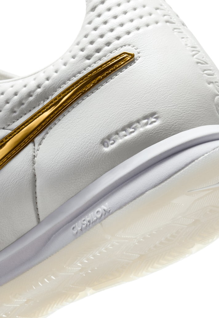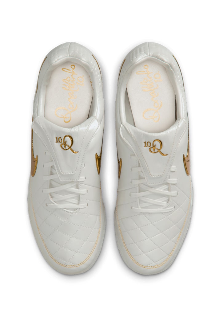 A crisp quilted leather upper sets the tone, dipped in clean white and accented with rich, regal hits of gold throughout. From the Swoosh to the bespoke “R” lace charm and tongue branding, it’s a masterclass in subtle luxury. The iconic fold-over tongue returns—pure R10 energy—while a Cushlon sole brings the comfort to match the charisma. The result is a shoe that feels as good as it looks, crafted for those who appreciate the game but live beyond the lines.