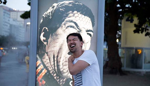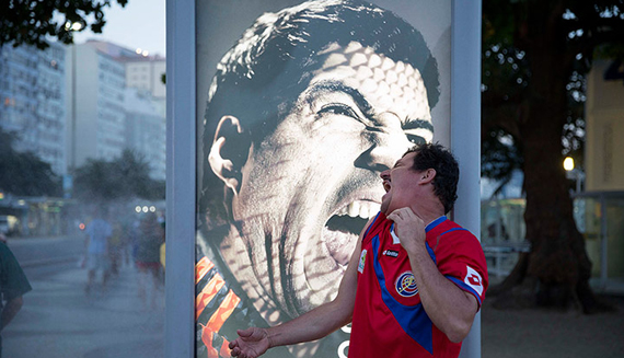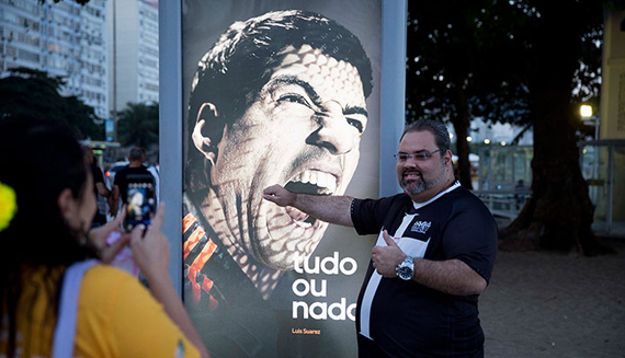 Since the Liverpool striker decided to bag a hat trick of career bites by trying to maul Giorgio Chiellini's shoulder, thousands of fans strolling down the Copacabana have seized the opportunity for a brilliant photo playing on adidas' Battle Pack #allin on nothing campaign. The prints of Suarez screaming are placed on billboards all around Rio de Janeiro, at least it used to look like he was screaming, from now on all everyone can see is a hungry Uruguayan with the jaws of an angry pitbull terrier.