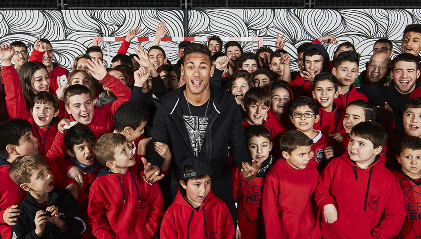 As well as the black and white tones that grace the boots, Bruno also added some of the famous Barcelona colours and Neymar Jr found the spray technique too, “I love how Bruno has captured a motto that is so important to me and I’m happy that this design is now on the wall of a pitch where kids play every day. I hope it will inspire them as much as it inspires me,” explains Neymar Jr. Naturally, cutting his teeth in football that hits the hard court, it's a familiar game for the Brazilian.